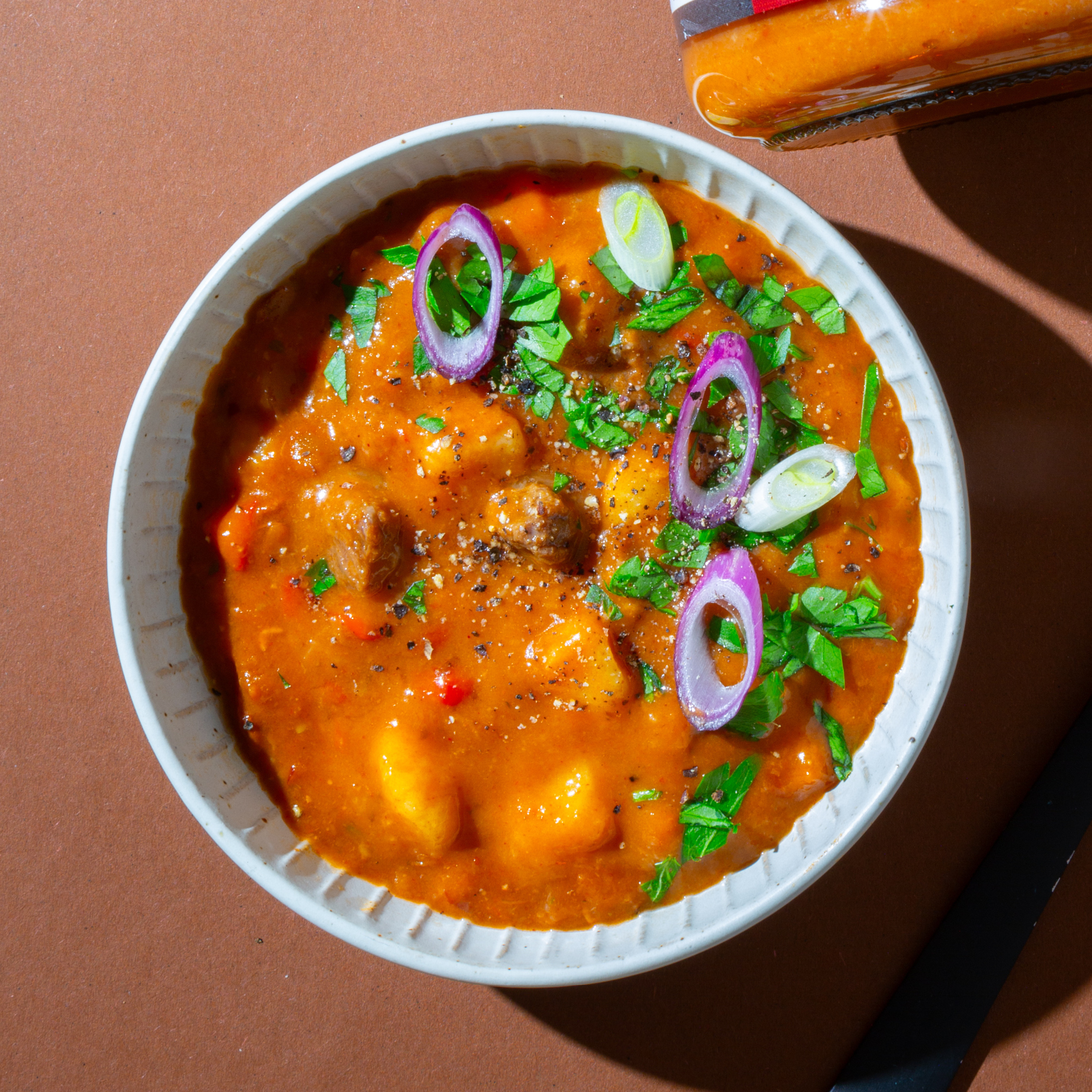 Für alle, die es lieber etwas deftig mögen, ist unsere Gulaschsuppe genau das Richtige. Das typisch ungarische Gericht ist dank magerem Bio-Rindfleisch, schmackhafter Paprika und leckeren Kartoffeln besonders reichhaltig und sättigend und daher ideal für eine vollwertige Mittagsmahlzeit. Damit das Gericht auch authentisch ungarisch schmeckt, haben wir es mit den traditionellen Gewürzen Knoblauch, Kreuzkümmel und Pfeffer sowie Majoran und Thymian abgeschmeckt. Unsere schnelle, gesunde Gulaschsuppe findest du natürlich in unserem Suppen Online Shop.