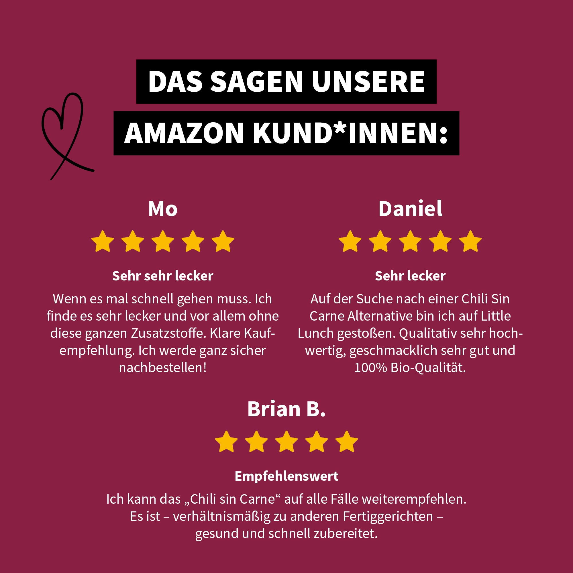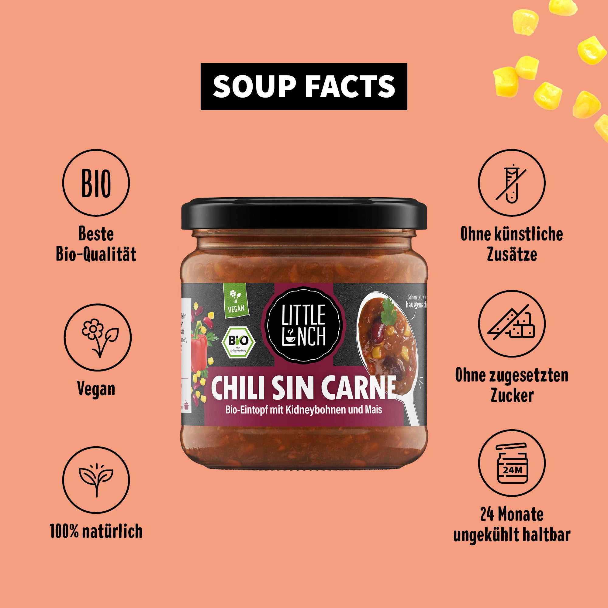 Wasser, Tomatenpüree* 29%, Mais* 7%, Kidneybohnen* getrocknet 7%, Kartoffeln* 5%, Sojaeiweißerzeugnis* 4%, rote Paprika* 3%, Karotten* 3%, Sellerie* 3%, Sonnenblumenöl*, Reismehl*, Traubensaft aus Traubensaftkonzentrat*, Meersalz, Maisstärke*, Knoblauch*, Kreuzkümmel*, Paprikapulver*, Koriandersamen* gemahlen, Zimt*, Lorbeerblätter* gemahlen, rotes Chilipulver*.