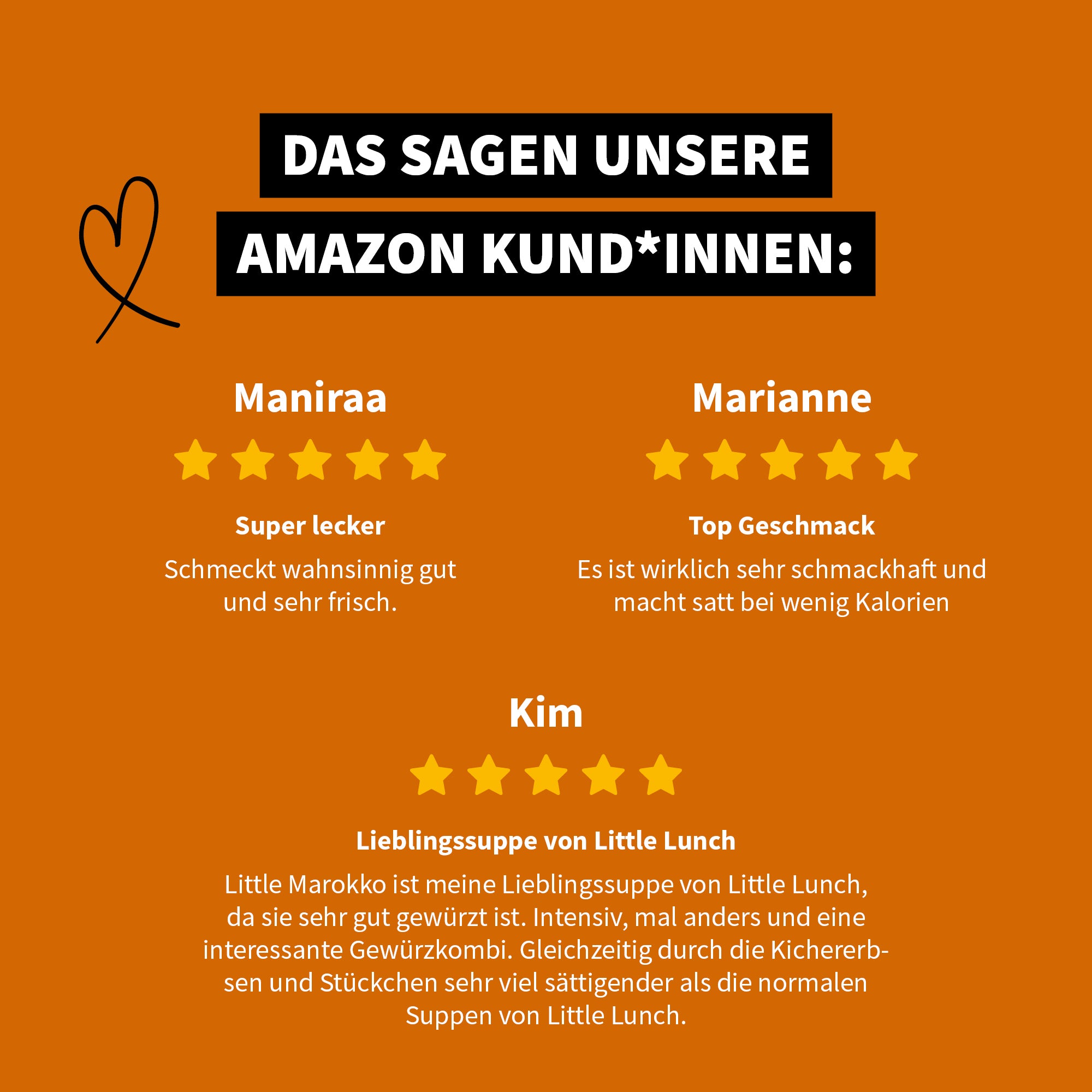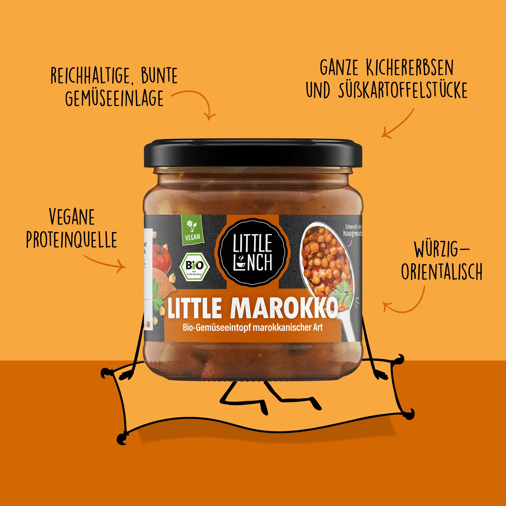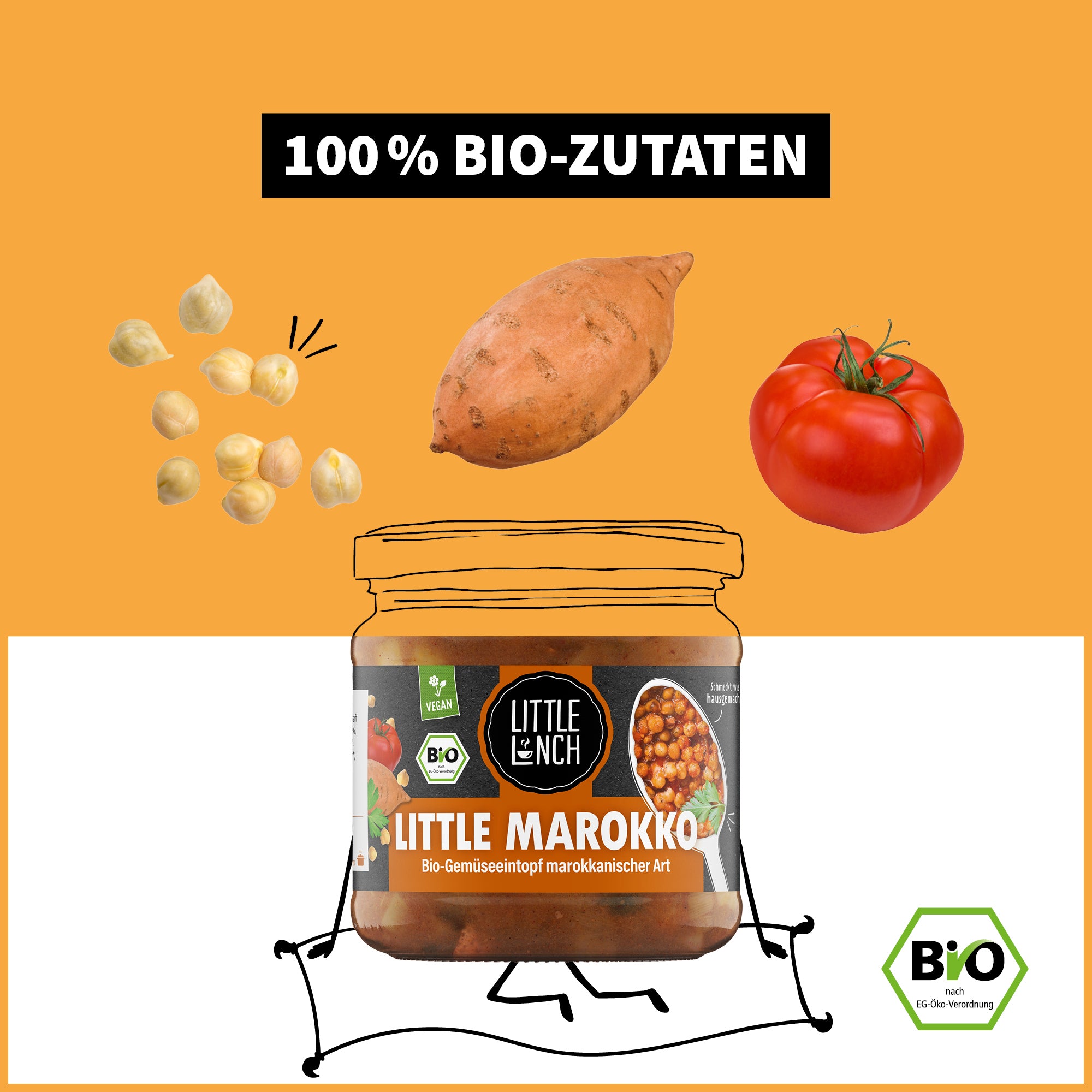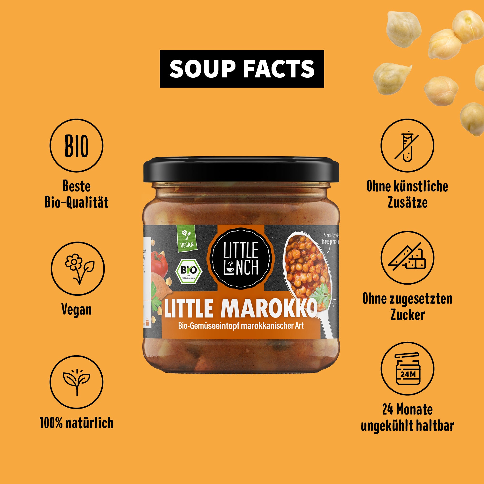 Tomaten* 19%, Wasser, Kichererbsen* 17%, Kartoffeln* 15%, Apfelsaft aus Apfelsaftkonzentrat*, Süßkartoffeln* 8,5%, Karotten* 7,5%, Zwiebeln* 5%, Zucchini* 2,5%, Sonnenblumenöl*, Meersalz, Verdickungsmittel Guarkernmehl*, Koriander*, Kreuzkümmel*, Knoblauch*, Kurkuma*, Fenchel*, Bockshornklee*, Zimt*, Kümmel*, Kardamom*, Ingwer*, Pfeffer*, Chili*.