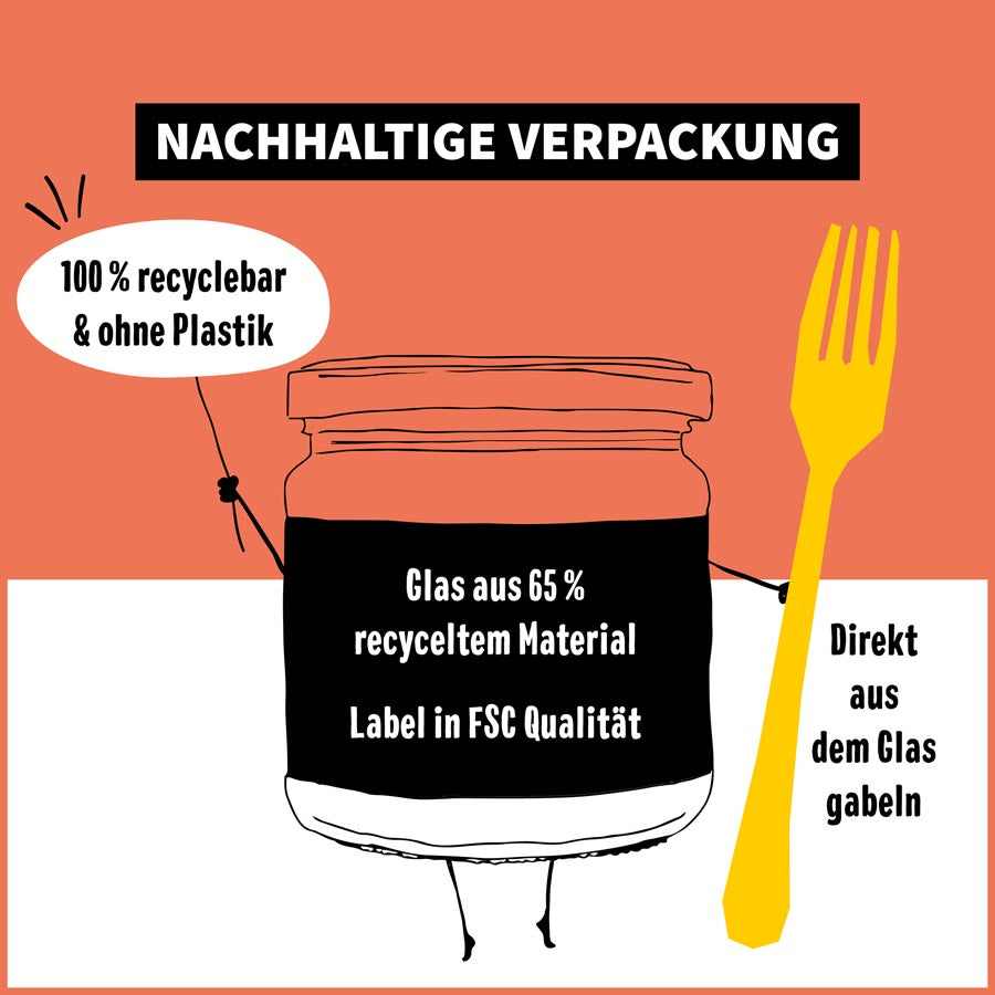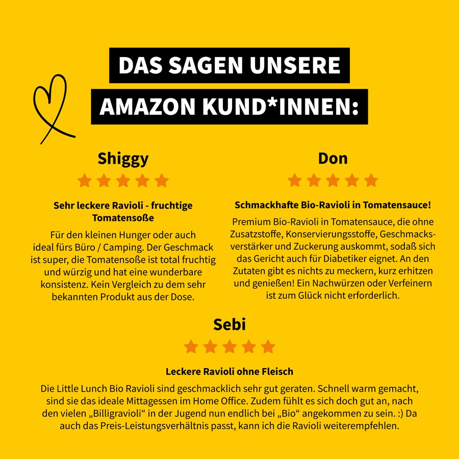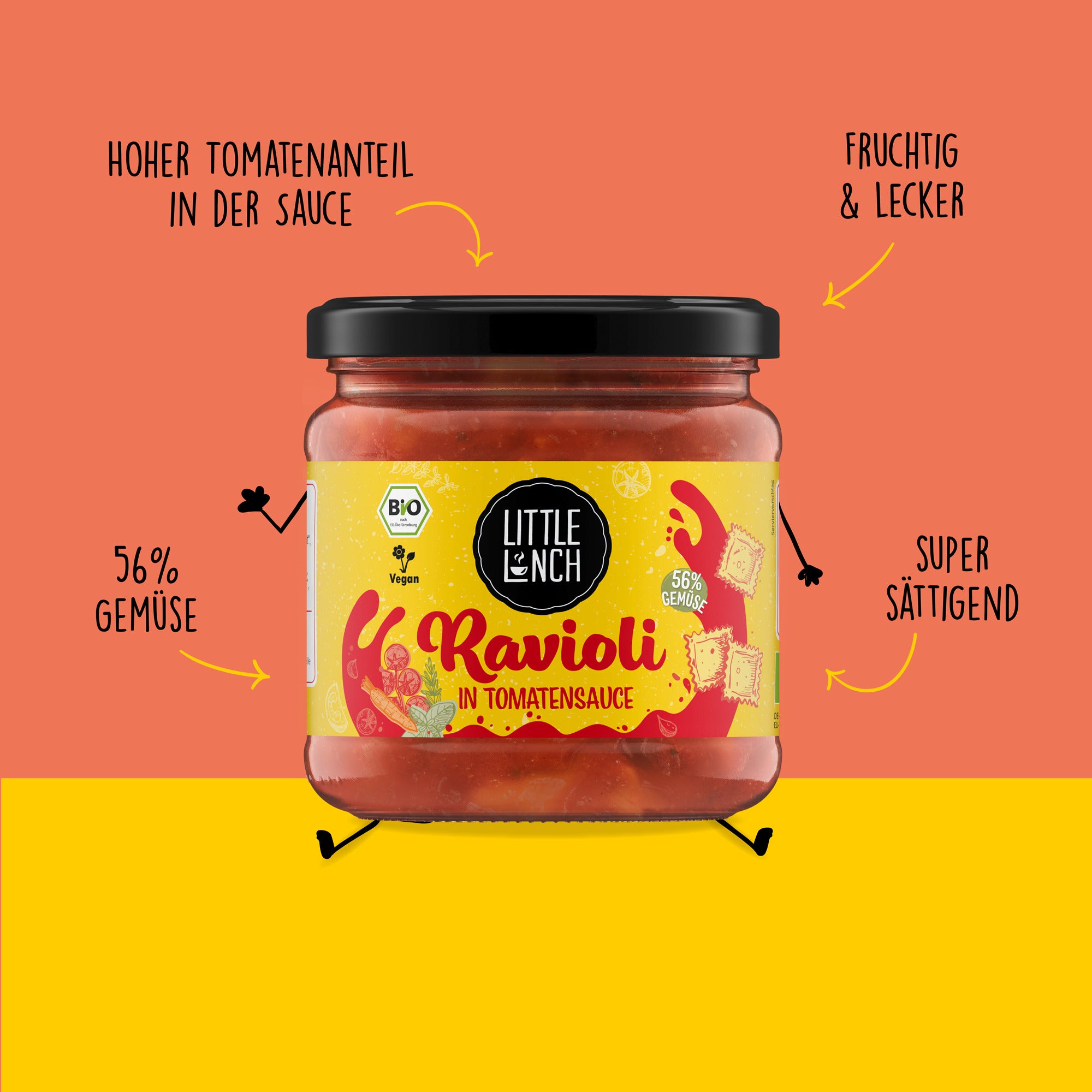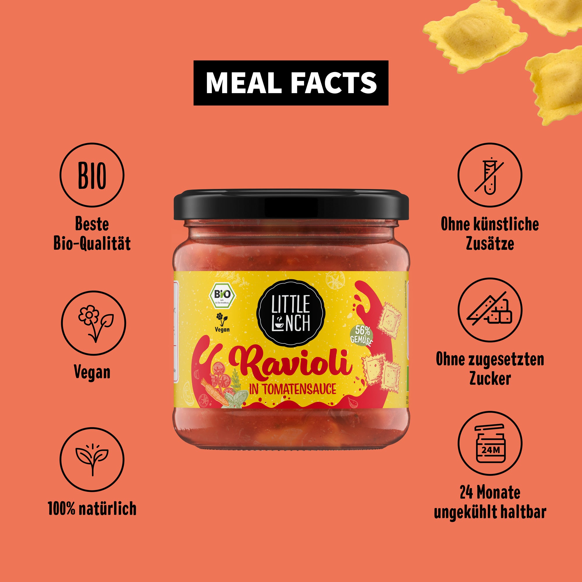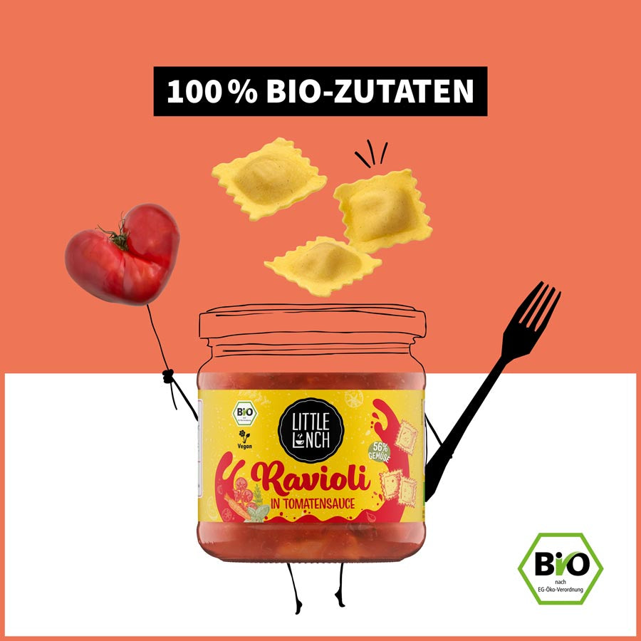 Passierte Tomaten* 36 %, Tomaten* 15%, Ravioli* 14 % (Hartweizengrieß*, Wasser, Gemüse 0,7%* (Karotten*, Pastinaken*, Zwiebeln*, Paprika*, Tomaten*), Kartoffelflocken*, Paniermehl* (Weizenmehl*, Hefe*, Salz), Sonnenblumenöl*, Weizengluten*, Meersalz, Luch*, Liebstöckel, Petersilie*, Kurkuma*, Muskatnuss*, Pfeffer*, Spinat*, Tomatenpulver*), Zwiebeln* 7%, Traubensaft aus Traubensaftkonzentrat*, Wasser, Karotten* 5%, Apfelsaft aus Apfelsaftkonzentrat*, Sonnenblumenöl*, Maisstärke*, Meersalz, Zwiebelpulver*, Basilikum*, Knoblauch*, Petersilie*, Pfeffer*, Oregano*, Liebstöckel*.