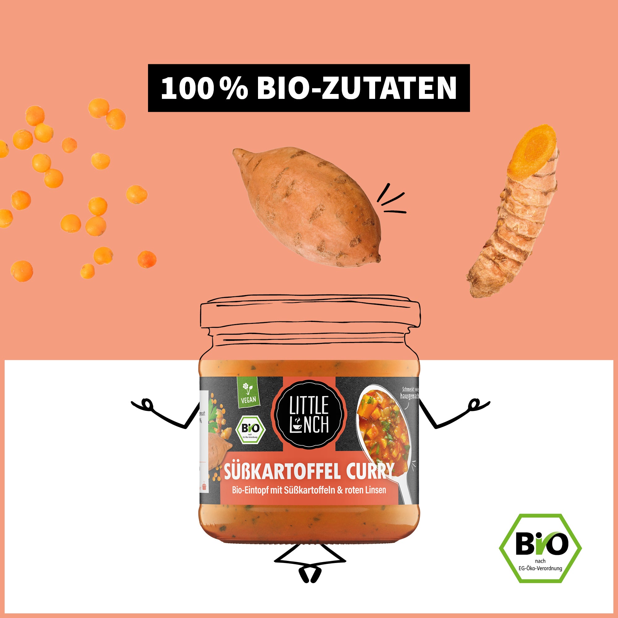 Süßkartoffeln* 20%, Wasser, Karotten* 13%, Zucchini 12%, Kartoffeln* 10%, Zwiebeln* 7%, Tomatenpüree* 6%, rote Linsen* 6%, Traubensaft aus Traubensaftkonzentrat*, Sonnenblumenöl*, Meersalz, Currypulver* 0,4%, Knoblauchpulver*, Limettensaft aus Limettensaftkonzentrat*, Kurkuma*, Koriandergrün*, Petersilie*, Paprikapulver*, Stärke*, Cumin*, Pfeffer*, Verdickungsmittel: Johannisbrotkernmehl*.