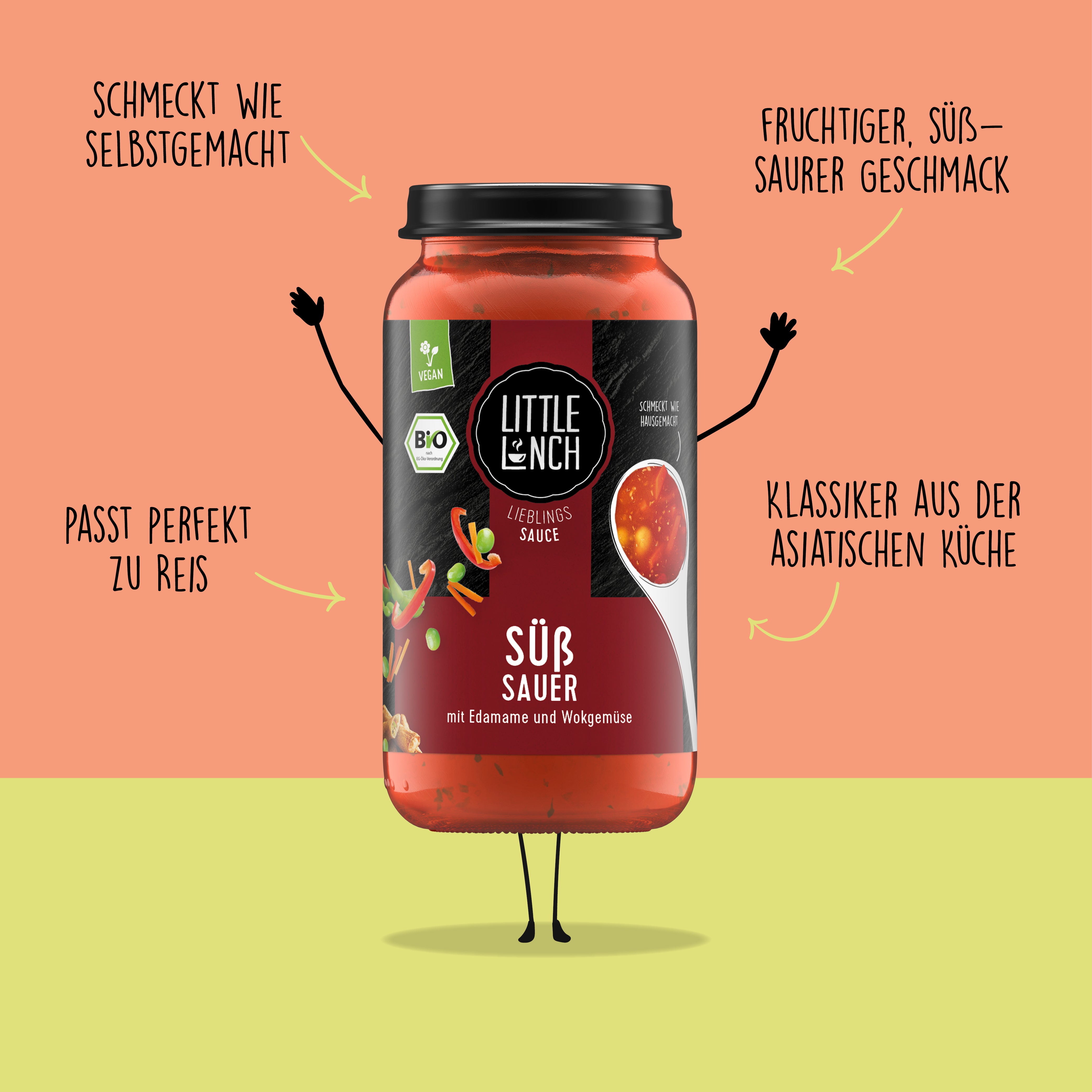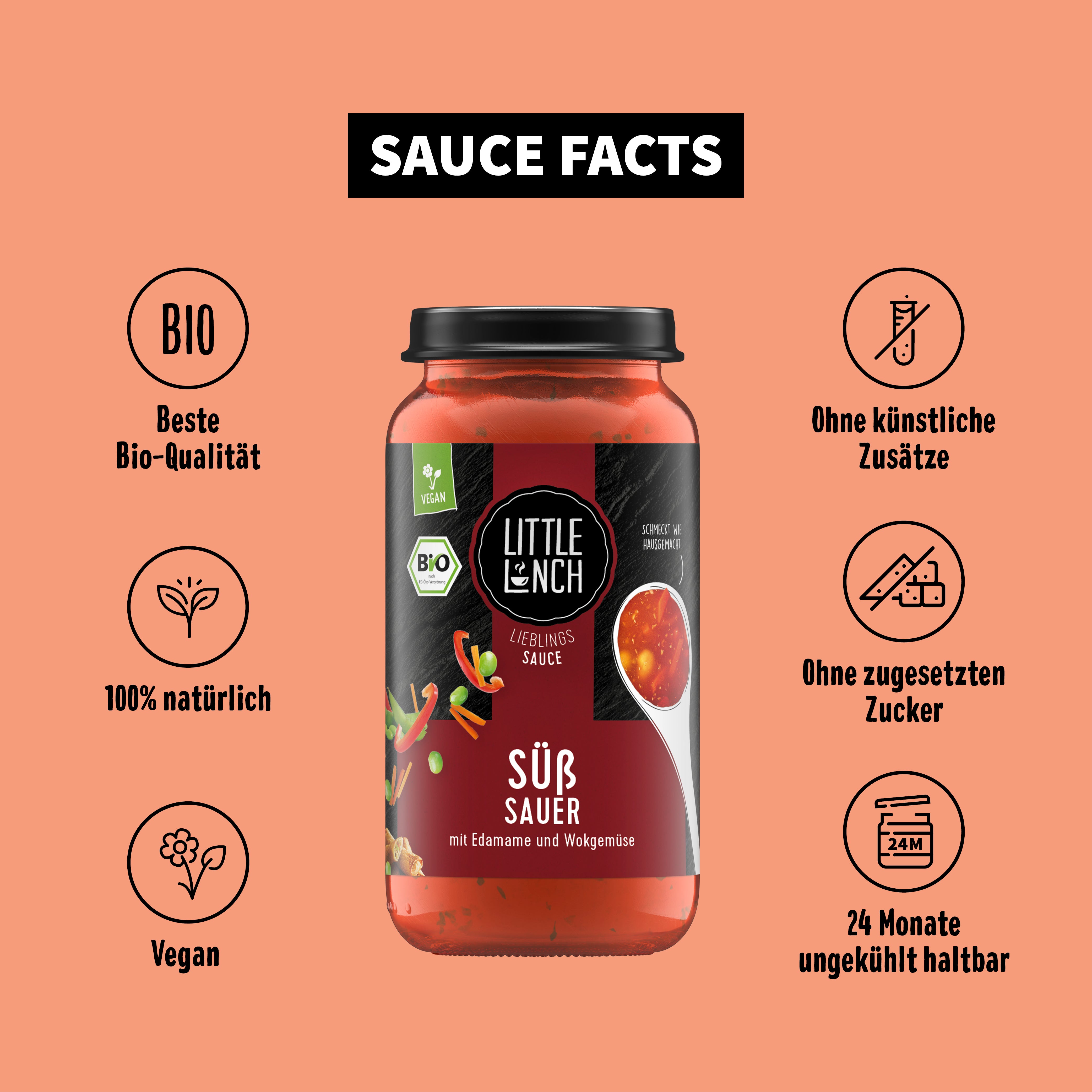 Traubensaft* aus Traubensaftkonzentrat, Tomatenpüree*, 8% Karotten*, 4% rote Paprika*, 4% Zwiebeln*, 3,5% grüne SOJABOHNEN*, 3,5% Mungobohnensprossen*, Stärke*, Weißweinessig*, SOJAsauce* (Wasser, SOJABOHNEN*, Salz), Meersalz, Tomatenmark* (zweifach konzentriert), Zitronensaft* aus Zitronensaftkonzentrat, 0,4% Kokosrapel*, Verdickungsmittel Guarkernmehl*, Gewürze* (Knoblauch, Ingwer, Chili).