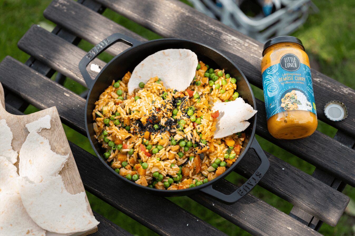 Einfache Camping Rezepte mit Little Lunch: Gemüse-Reispfanne mit Curry Sauce