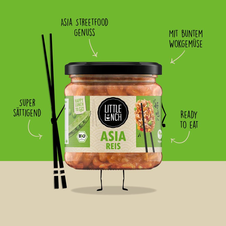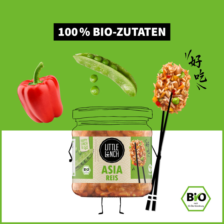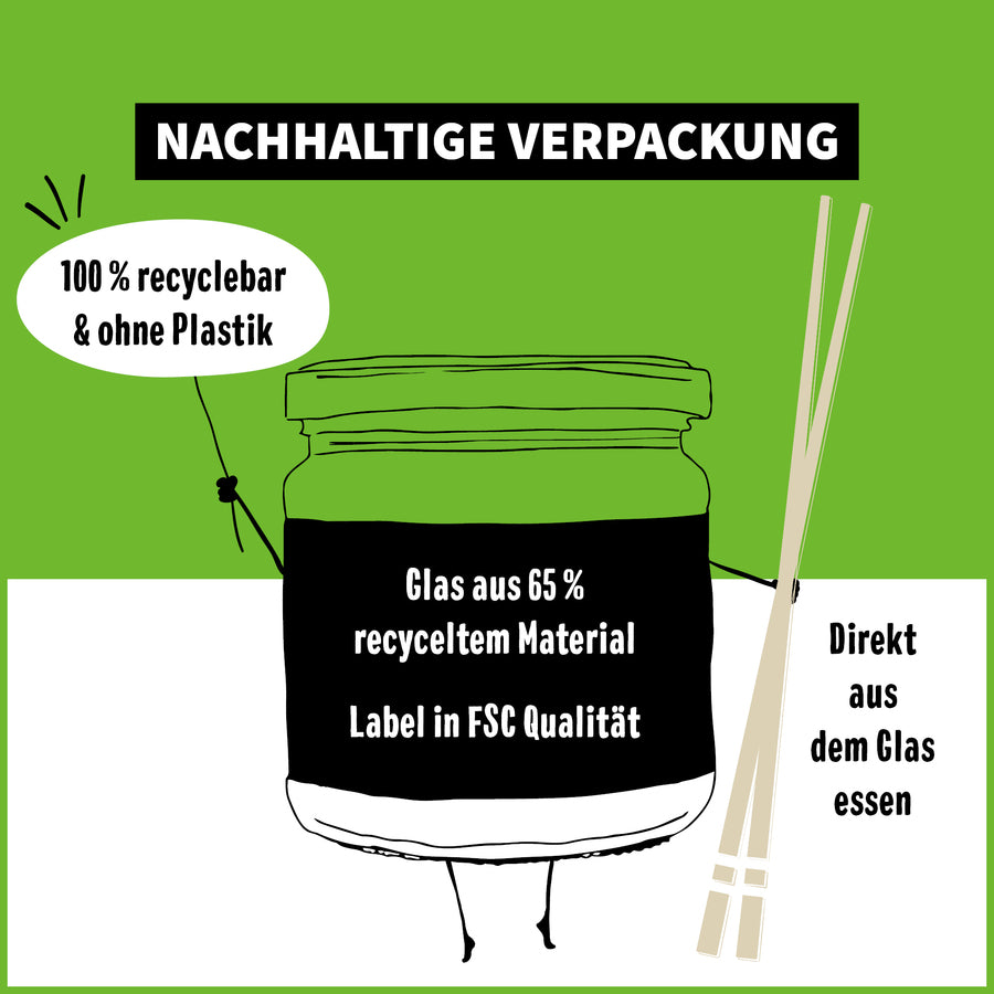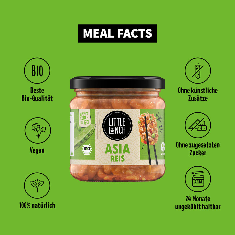 Wasser, Naturreis* 11%, Karotten* 11%, Sojabohnen* 6%, Paprika* gelb 5%, Sojasauce* (Wasser, Sojabohnen*, Salz) 3.8%, Zwiebeln* geröstet, Paprika* rot 2.5%, Mungbohnenkeimlinge* 2.5%, Lauch* 2.5%, Erbsen* 2.5%, Zwiebel* 2.5%, Sonnenblumenöl*, Knoblauch*, Koriander*, Meersalz, Verdickungsmittel: Guarkernmehl*, Maisstärke*, Kurkuma*, Chili*.