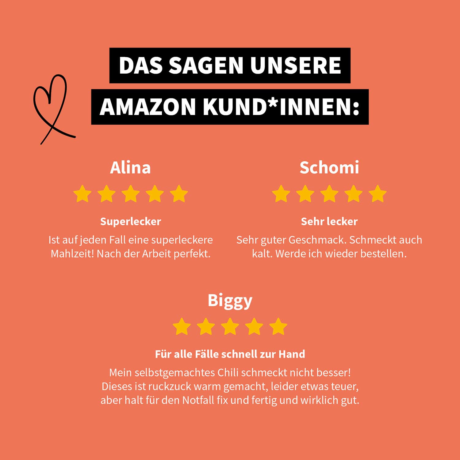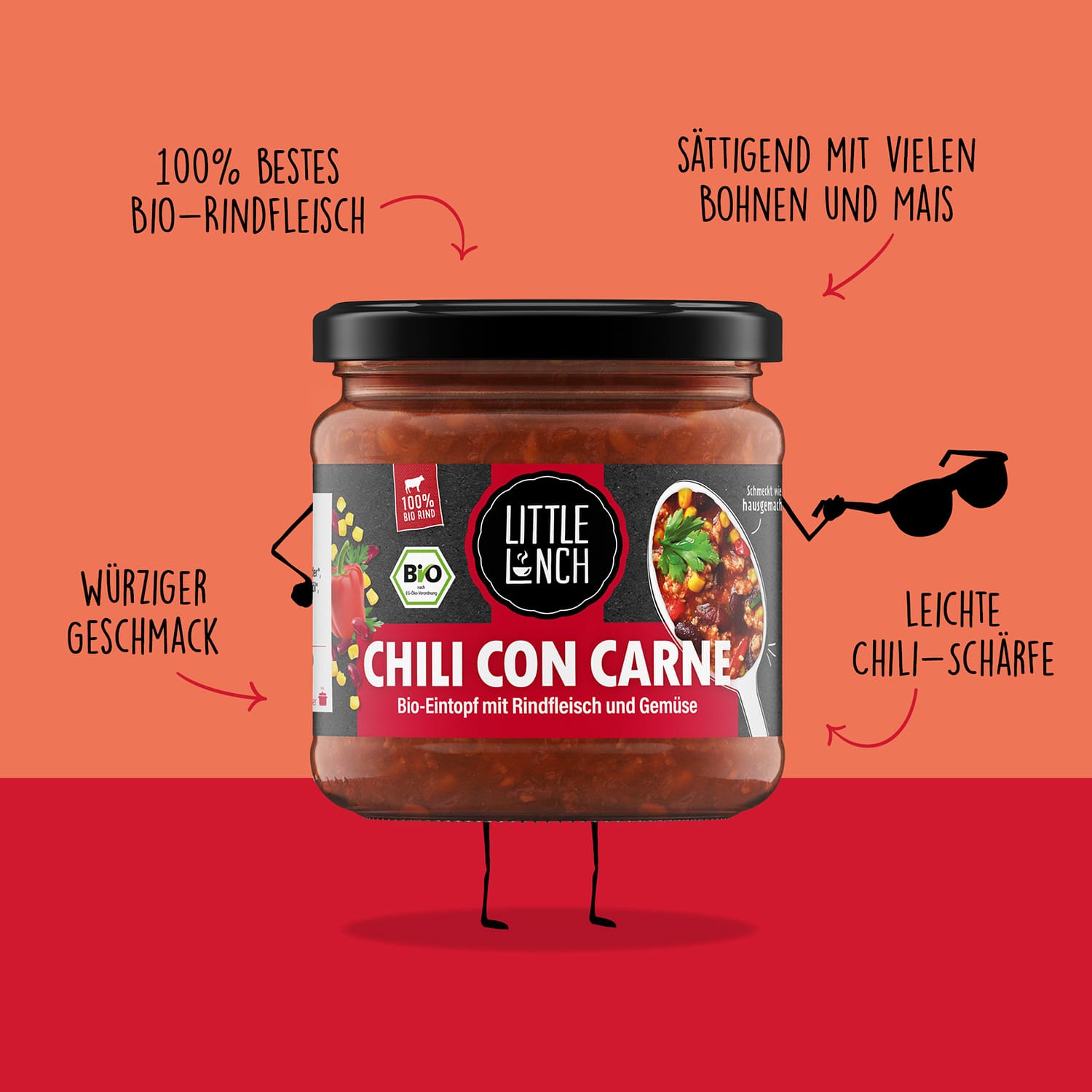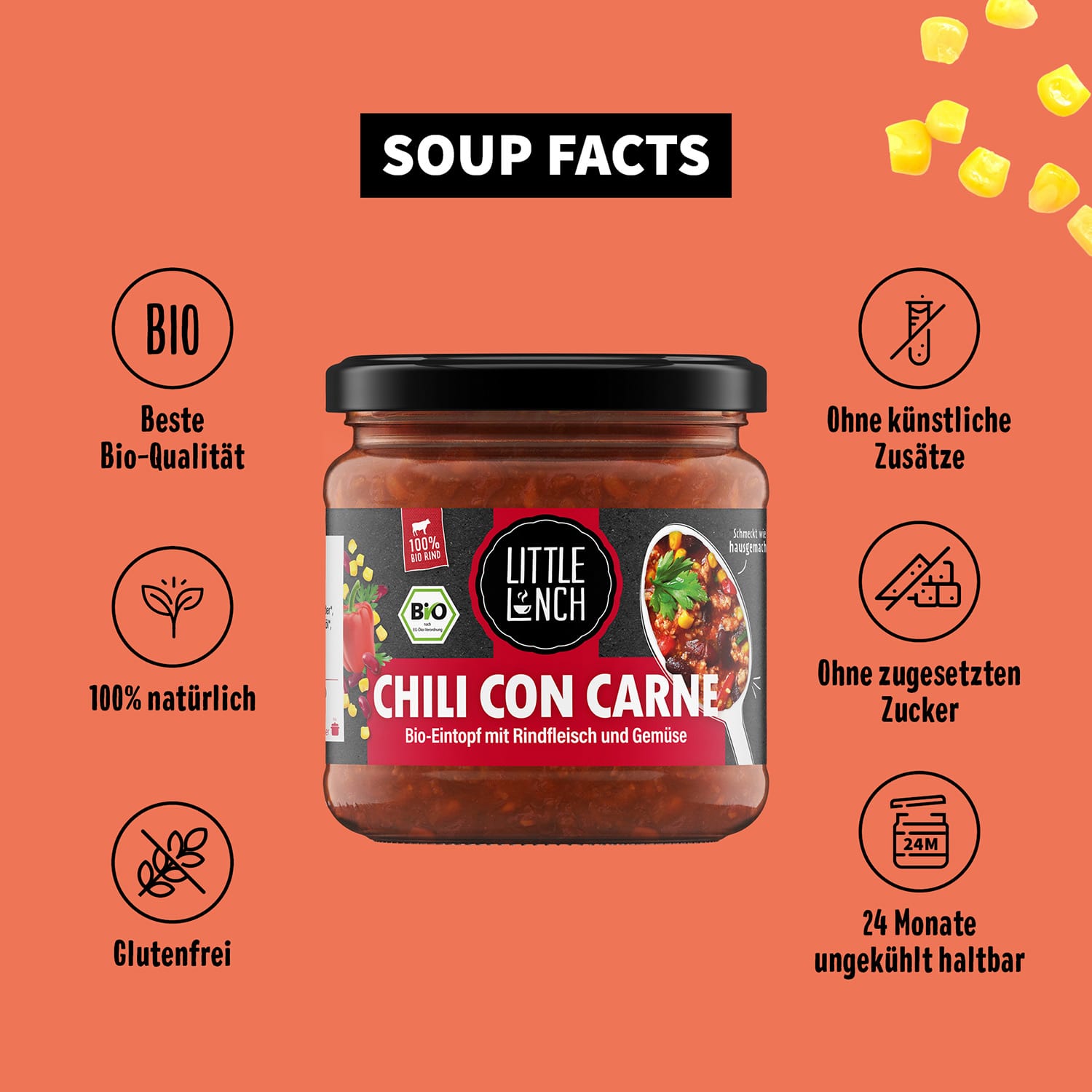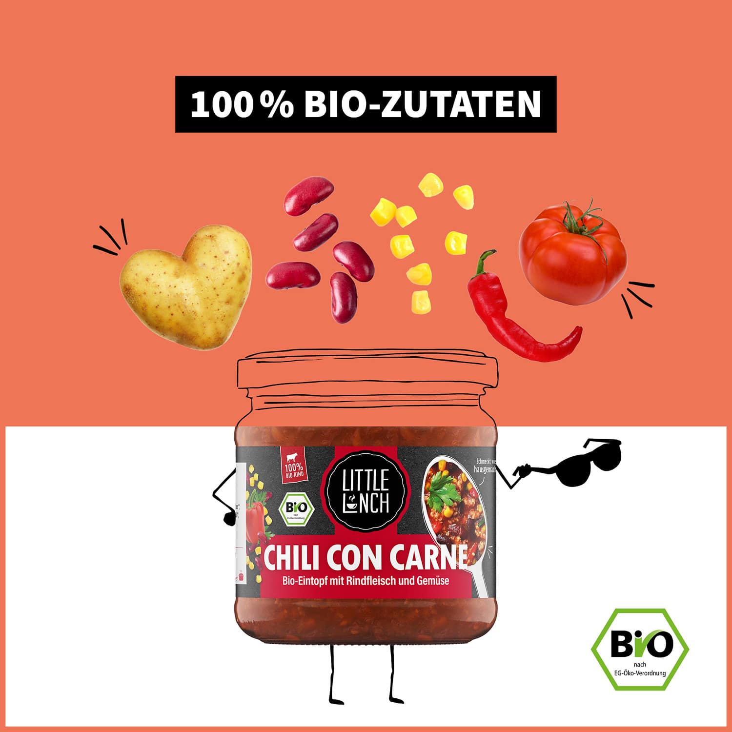 Der Party-Klassiker ab sofort auch Mittags fürs Büro: Unser Chili con Carne mit bestem Bio-Rindfleisch, leckerem Bio-Gemüse und angenehm leichter Chili-Schärfe. Damit ist unser Chili con Carne der ideale Sattmacher für die Mittagspause oder einfach, wenn es mal schnell gehen muss.