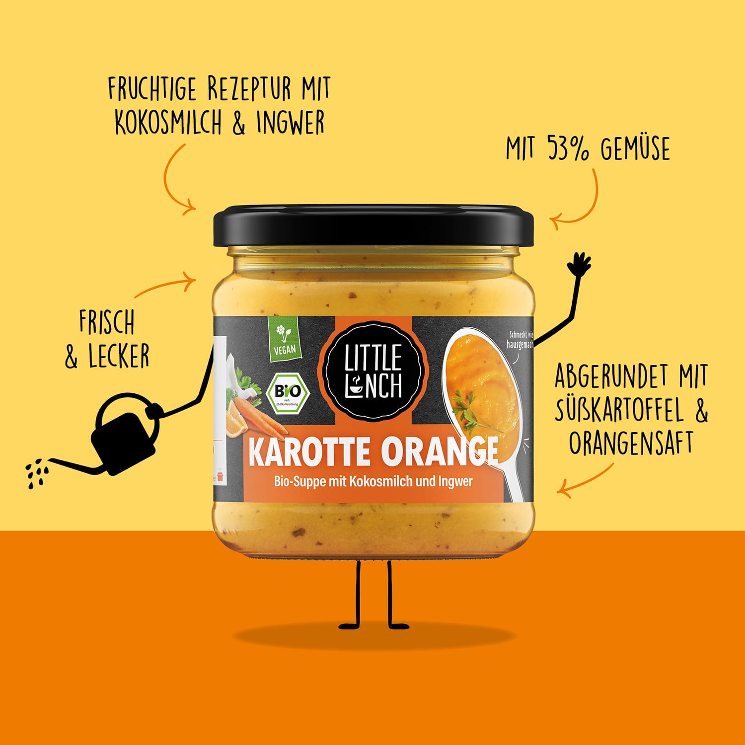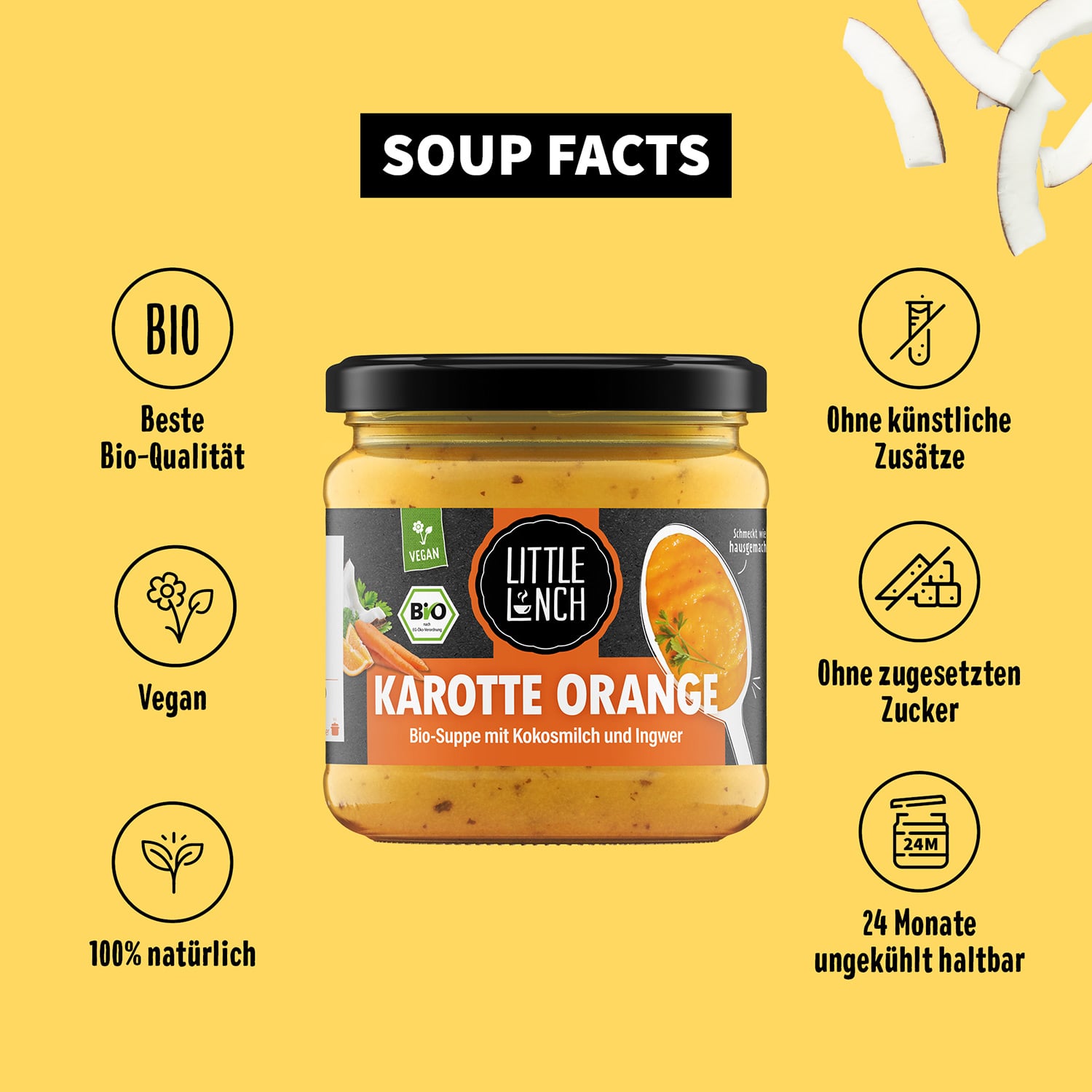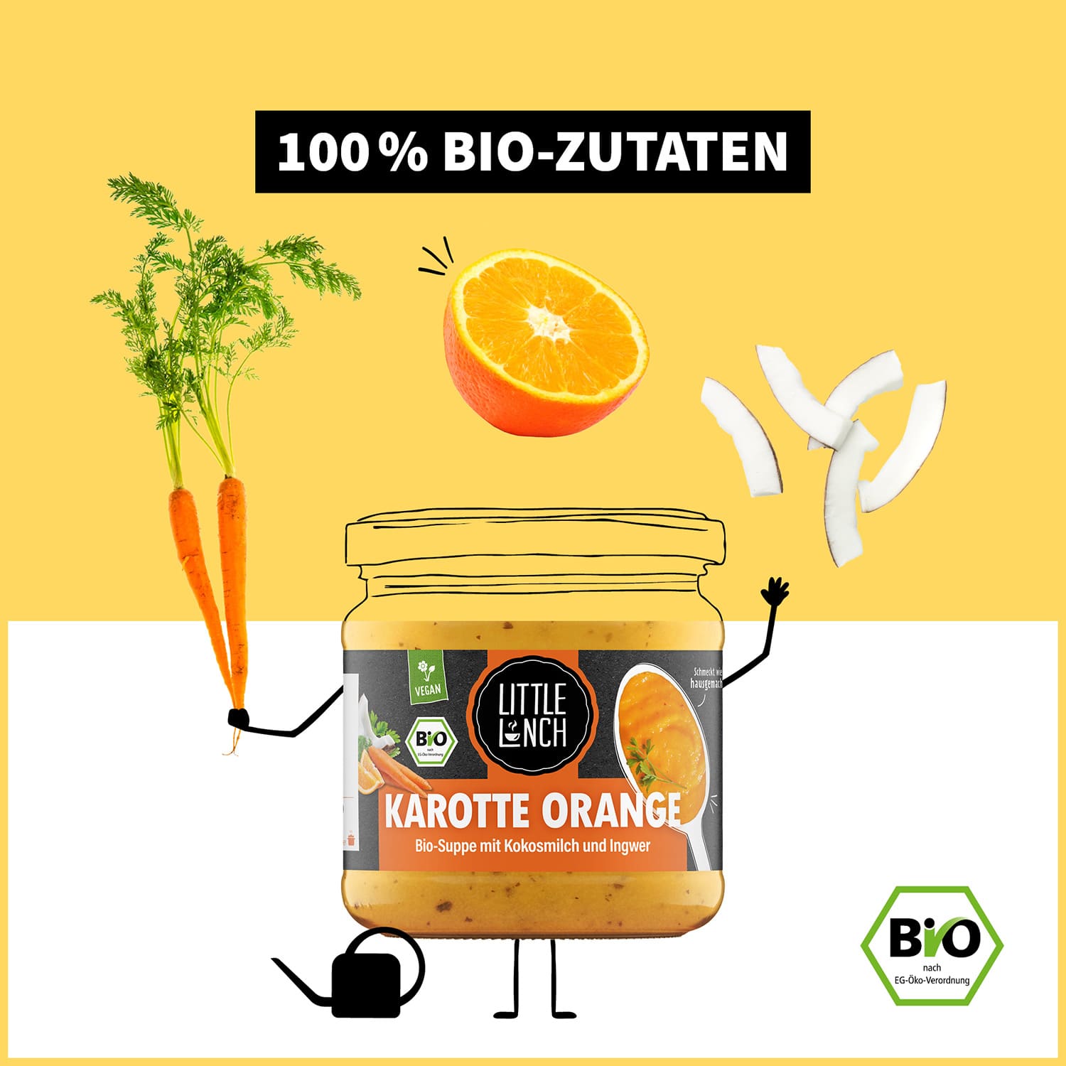 Karotten* 40%, Wasser, Zwiebeln* 8%, Süßkartoffeln* 5%, Kokosmilch* (Kokosnussfleisch*, Wasser) 4%, Orangensaft aus Orangensaftkonzentrat* 4%, Stärke*, Sonnenblumenöl*, Meersalz, Knoblauchpulver*, Ingwer* 0,18%, Pfeffer*, Petersilie*, Verdickungsmittel: Guarkernmehl* und Johannisbrotkernmehl*, Liebstöckel*.