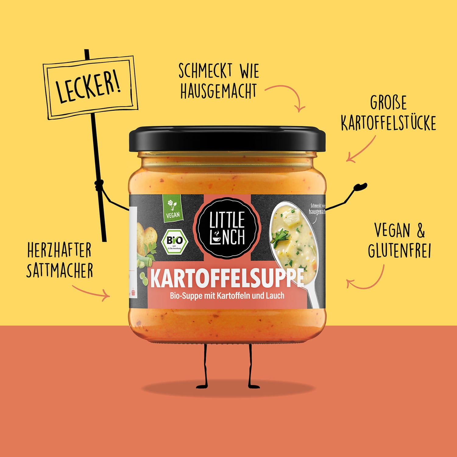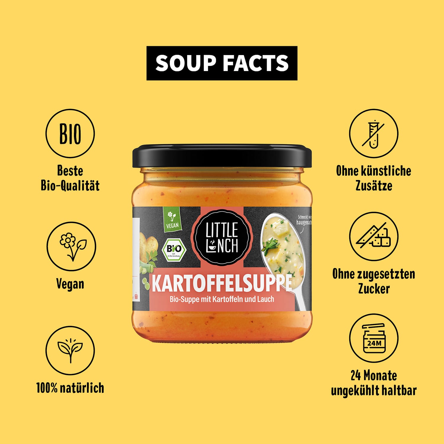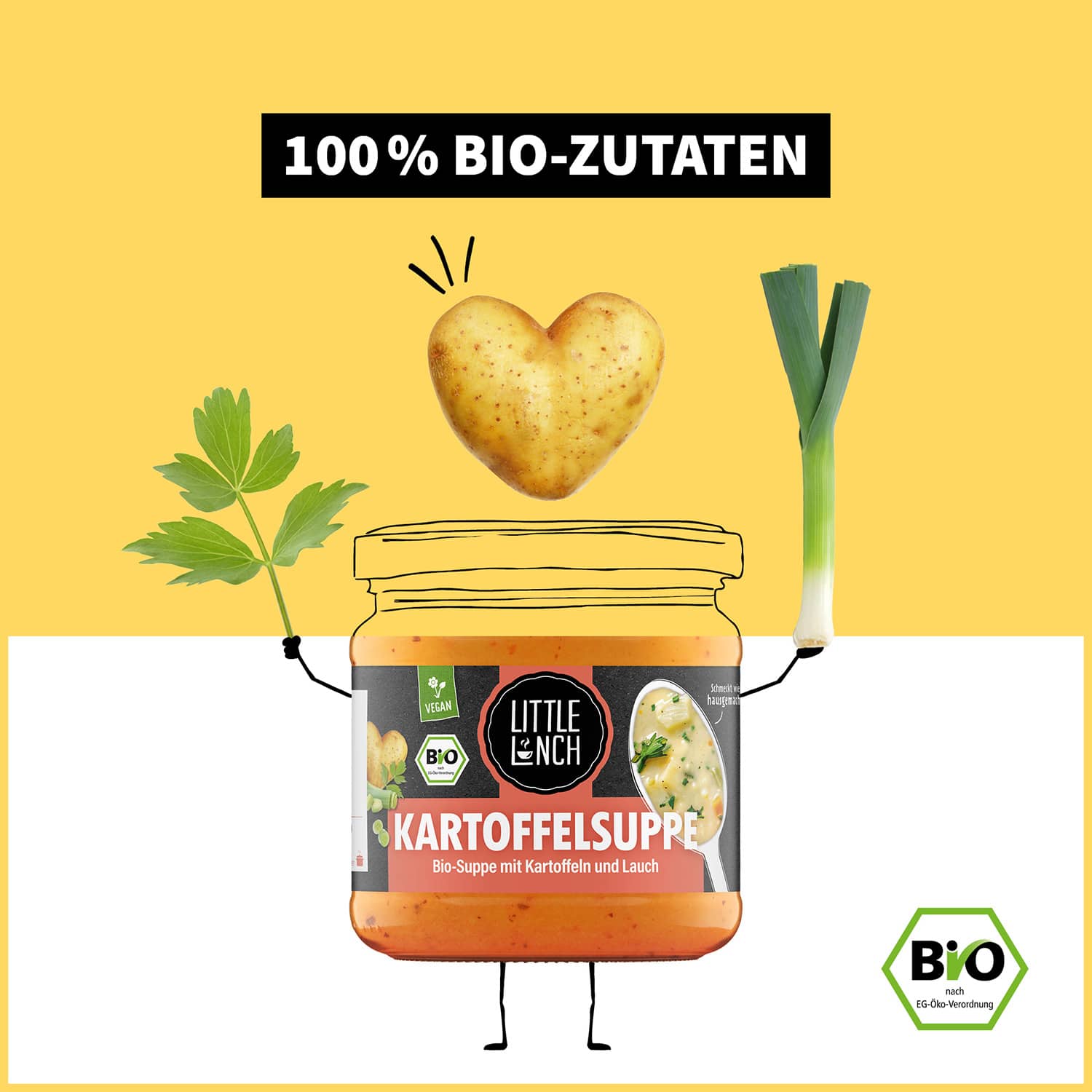 Du bist auf der Suche nach einer leckeren und vollwertigen Mahlzeit, die im Handumdrehen zubereitet ist? Dann ist die Little Lunch Kartoffelsuppe genau das Richtige für Dich: bereits verzehrfertig muss sie nur noch erwärmt werden und ist daher ideal, wenn es mal schneller gehen muss, Du aber trotzdem auf eine ausgewogene Ernährung achten möchtest. Geschmacklich sorgen die innovativen Rezepte unserer Little Lunch Gourmetküche mit besten Bio-Zutaten für ein ganz besonderes Erlebnis – und das ganz ohne künstliche Zusätze, Geschmacksverstärker und Konservierungsmittel. Die außergewöhnliche Kombination aus feinen Pellkartoffeln und exotischen Süßkartoffeln wurde mit Lauch, Liebstöckel und Majoran verfeinert. Weil wir bei Little Lunch großen Wert auf Nachhaltigkeit legen, ist die leckere Kartoffelsuppe außerdem umweltfreundlich in Glas abgefüllt.