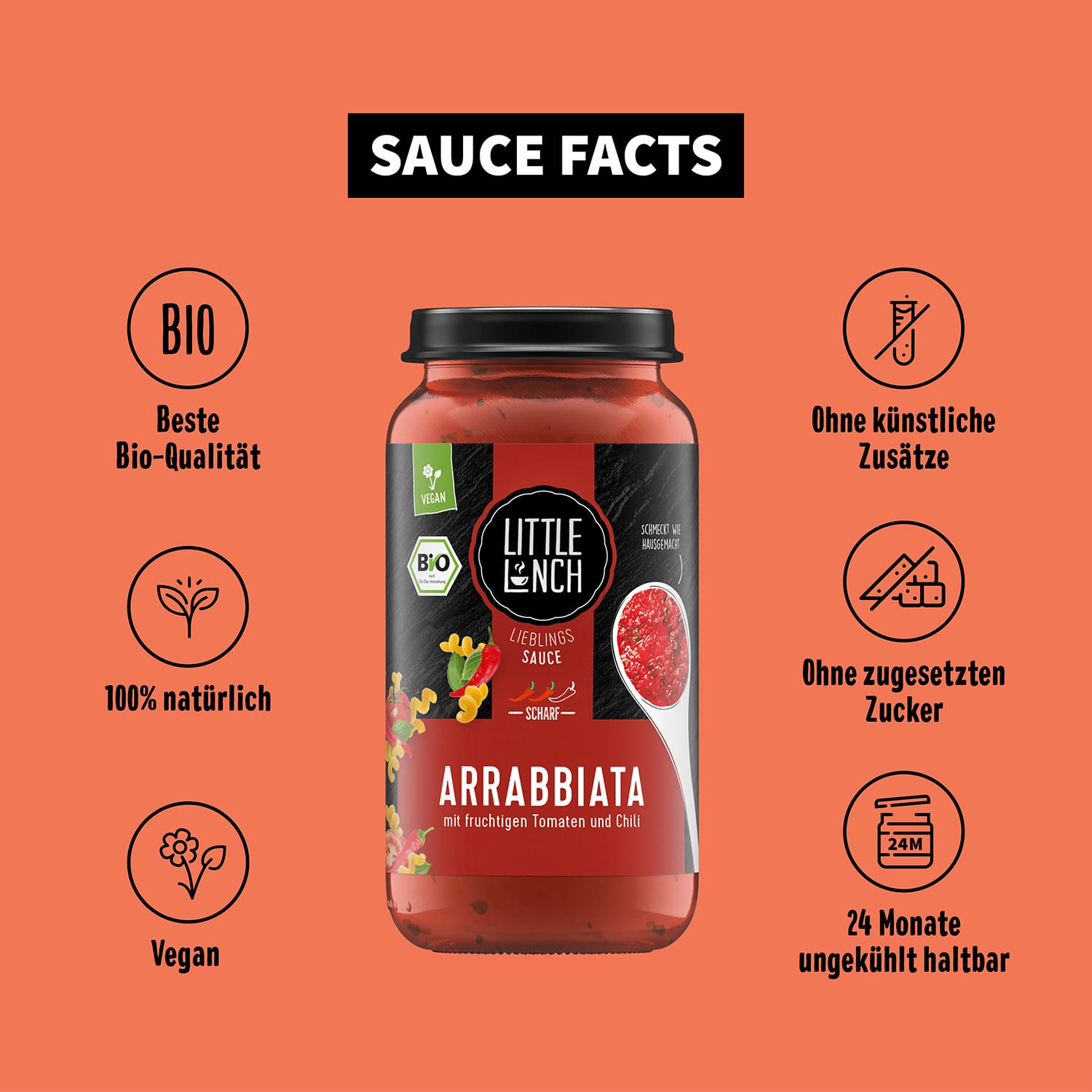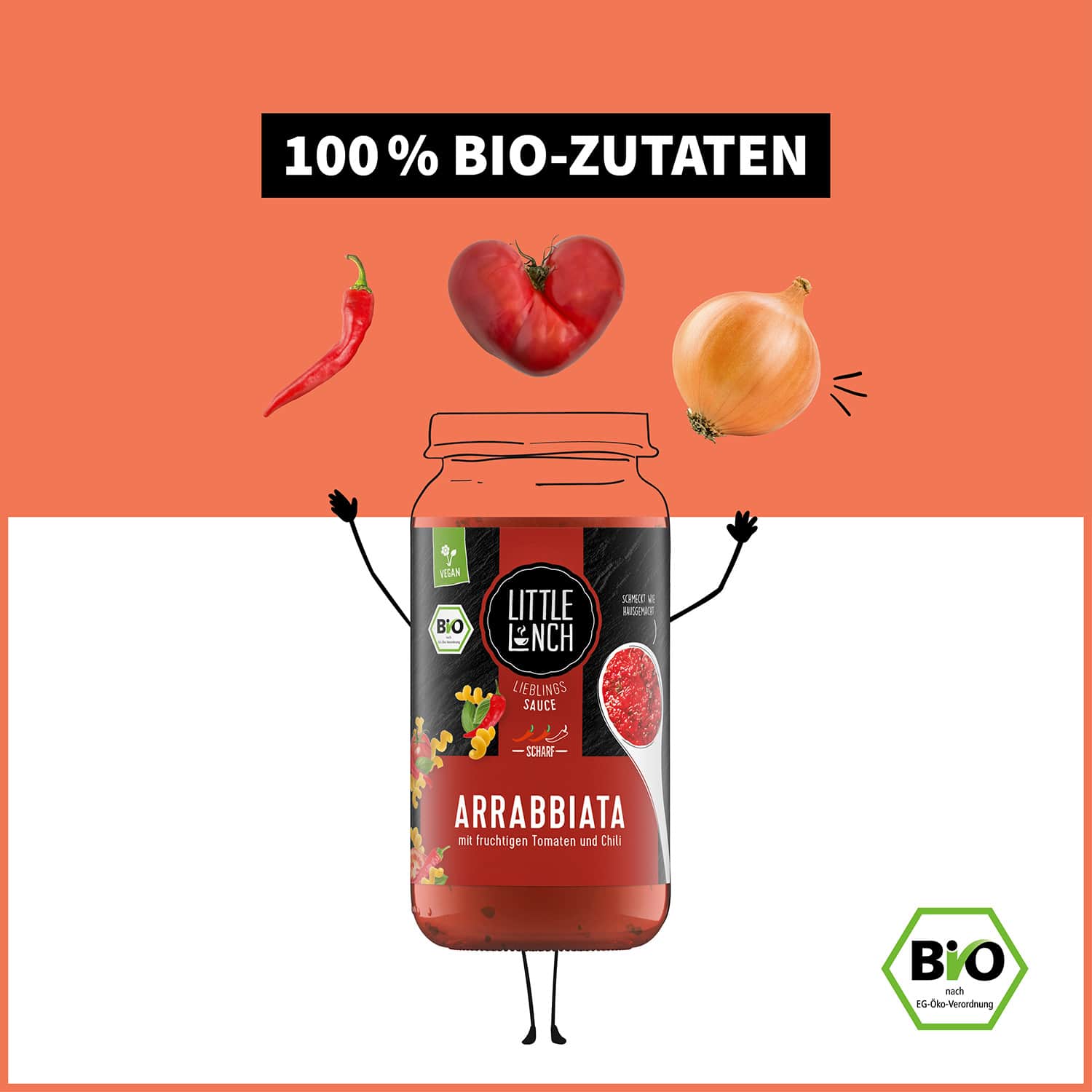 Die Arrabbiata-Sauce ist eine kulinarische Spezialität, erfunden von unserem stiefelförmigen, südlichen Beinahe-Nachbarn: Dem wunderschönen Italien. Doch nicht nur irgendwo in Italien, sondern im Herzen Italiens: Rom. Wer sich zu Schulzeiten für die anspruchsvolle, wenn auch leider ausgestorbene, Sprache Latein entschieden hat weiß, dass „arrabiato“ so viel bedeutet wie „verärgert“. Die Pasta Arrabbiata heißt also „Nudeln nach zorniger Art“. Aber wer ist zornig und was hat das mit dem beliebten Pasta-Gericht zu tun? Die Erklärung ist so überraschend wie ungewöhnlich: Wenn der Koch es mit der Chilli-Note etwas zu gut meint, sitzt man mit tränenden Augen, hochrotem Kopf und offenem Mund am Tisch – wie als wäre man sehr (sehr!) verärgert. Bei unserer Little Lunch Lieblingssauce Arrabbiata besteht da allerdings kein Grund zur Sorge. Unsere Köche haben mit viel Bedacht und Hingabe den Balance-Akt des perfekten Chilli-Schärfegrads gemeistert: pikant würzig ohne das Tränen fließen müssen. Zu dieser Balance tragen auch unsere Bio-Tomaten in der genau richtigen Menge bei. Unsere Lieblingssauce Arrabbiata enthält noch ein paar zusätzliche Zutaten, die das Geschmackserlebnis noch fruchtiger und vielschichtiger machen: süßlich-saurer Traubensaft, knackige Karotten verfeinert mit etwas Zitronensaft und einer großzügigen Prise Meersalz. Doch was wäre eine gute italienische Sauce ohne Kräuter? Nur halbfertig unserer Meinung nach. Deshalb wird unsere Lieblingssauce durch die Italo-Klassiker Basilikum, Oregano, Petersilie und Liebstöckel komplettiert. All unser Obst und Gemüse ist natürlich aus 100% Bio-Qualität und das schmeckt man auch. Jetzt eintauchen in das Little Lunch Arrabbiata-Geschmackserlebnis und etwas Gutes für sich und die Umwelt tun!