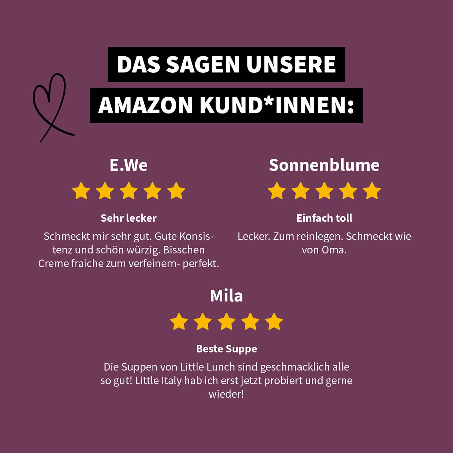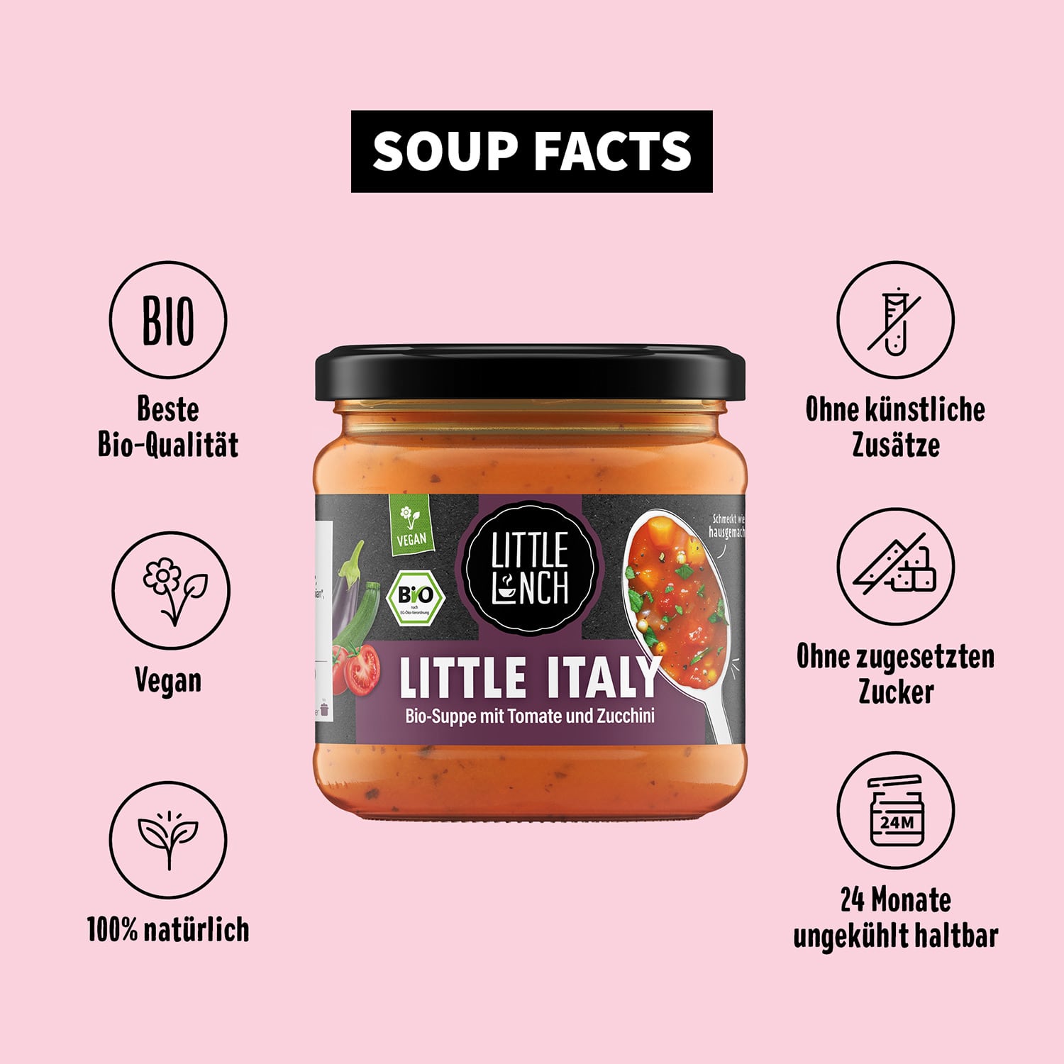 Inspiriert von dem italienischen Klassiker Minestrone, vereint die „Little Italy“ die frischen Aromen von Paprika, Tomaten, Zucchini und Auberginen in bester Bio-Qualität. Italienische Kräuter sorgen für ein mediterranes Geschmackserlebnis alla Mamma.