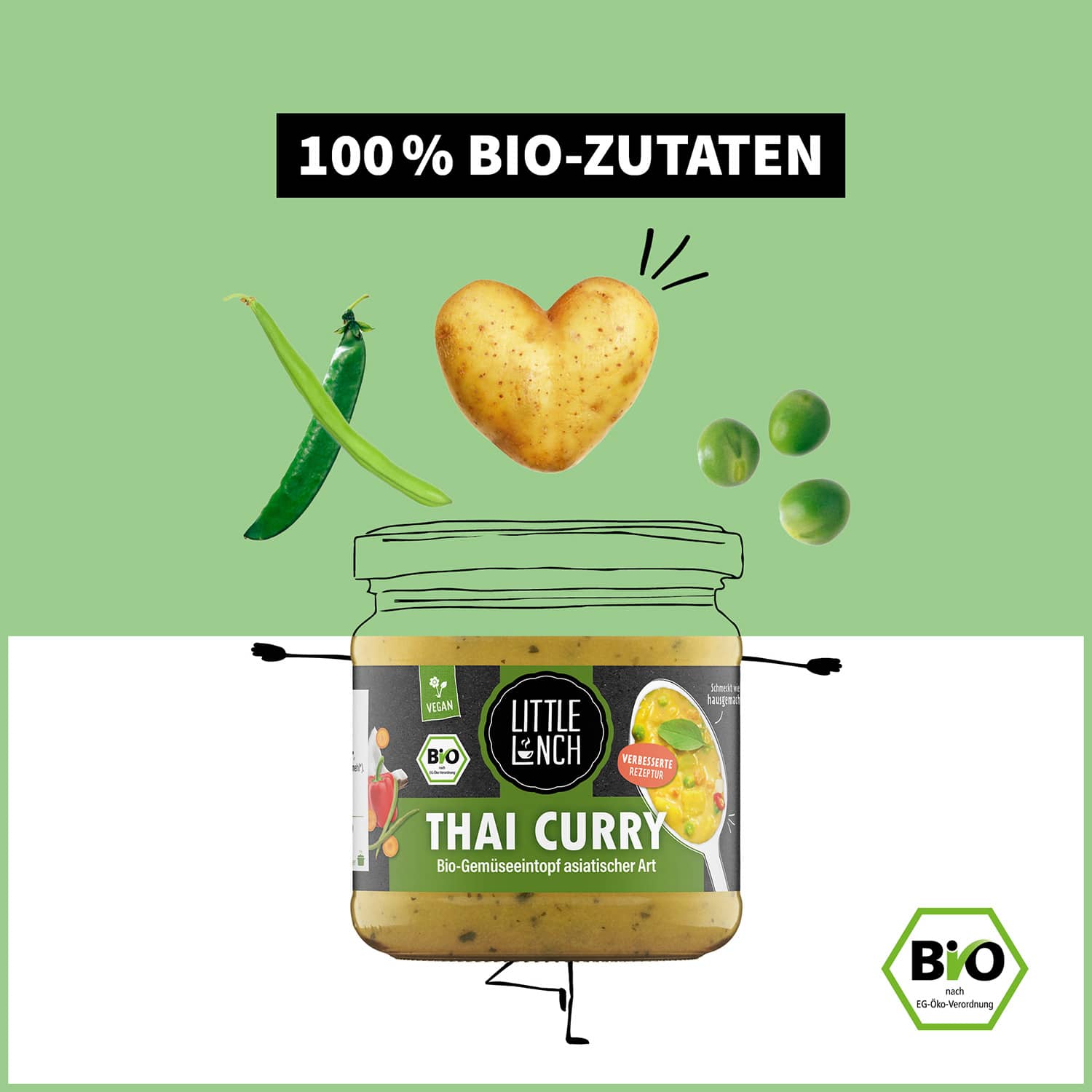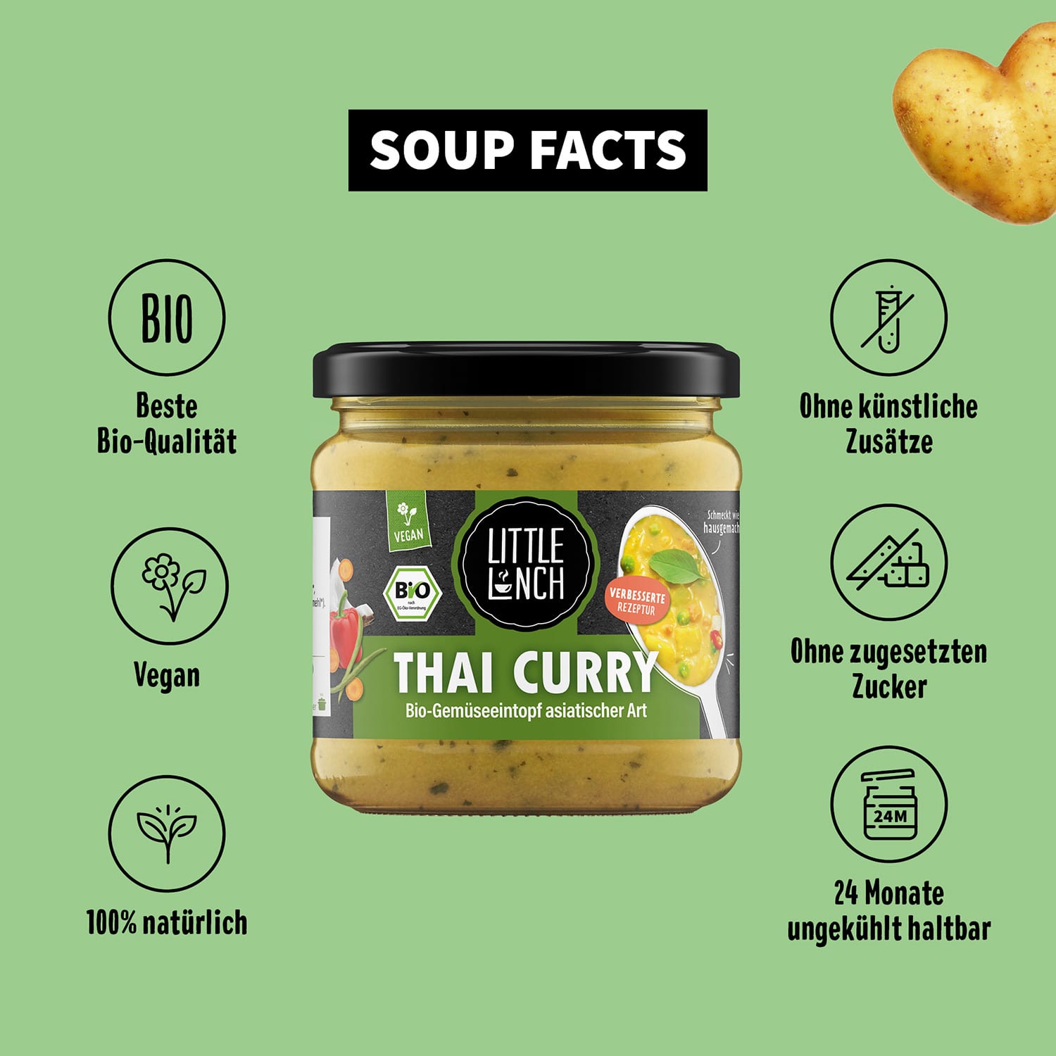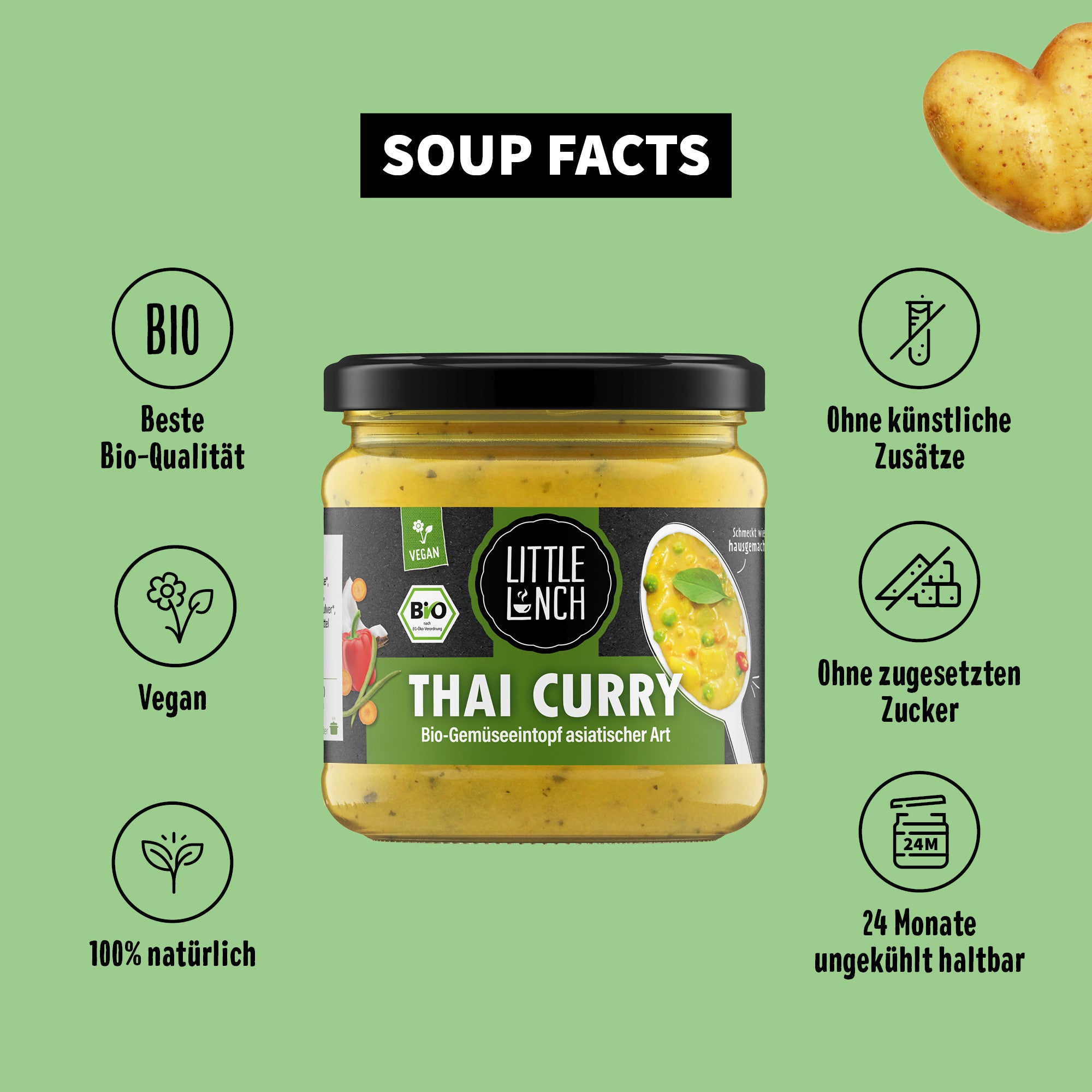 Wasser, Kartoffeln* 16%, Karotten* 12%, Zwiebeln* 6%, grüne Bohnen* 6%, Erbsen* 6%, rote Paprika* 5%, Traubensaft aus Traubensaftkonzentrat*, Stärke*, Kokosmehl* 1,5%, Sonnenblumenöl*, Meersalz, Currypulver* 0,6%, Knoblauch*, Korianderblätter*, Zitronengras*, Zitronensaftkonzentrat*, Verdickungsmittel (Guarkernmehl*, Johannisbrotkernmehl*).