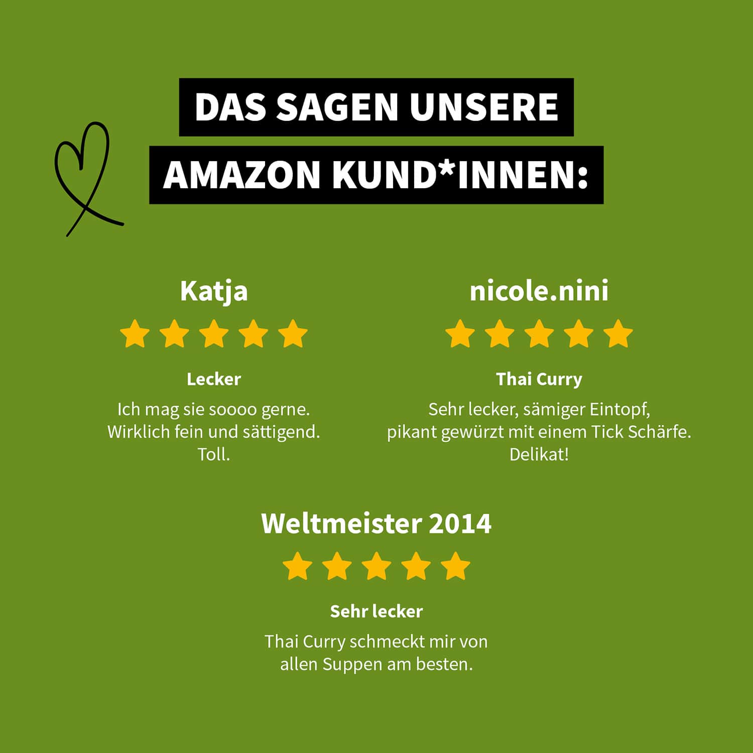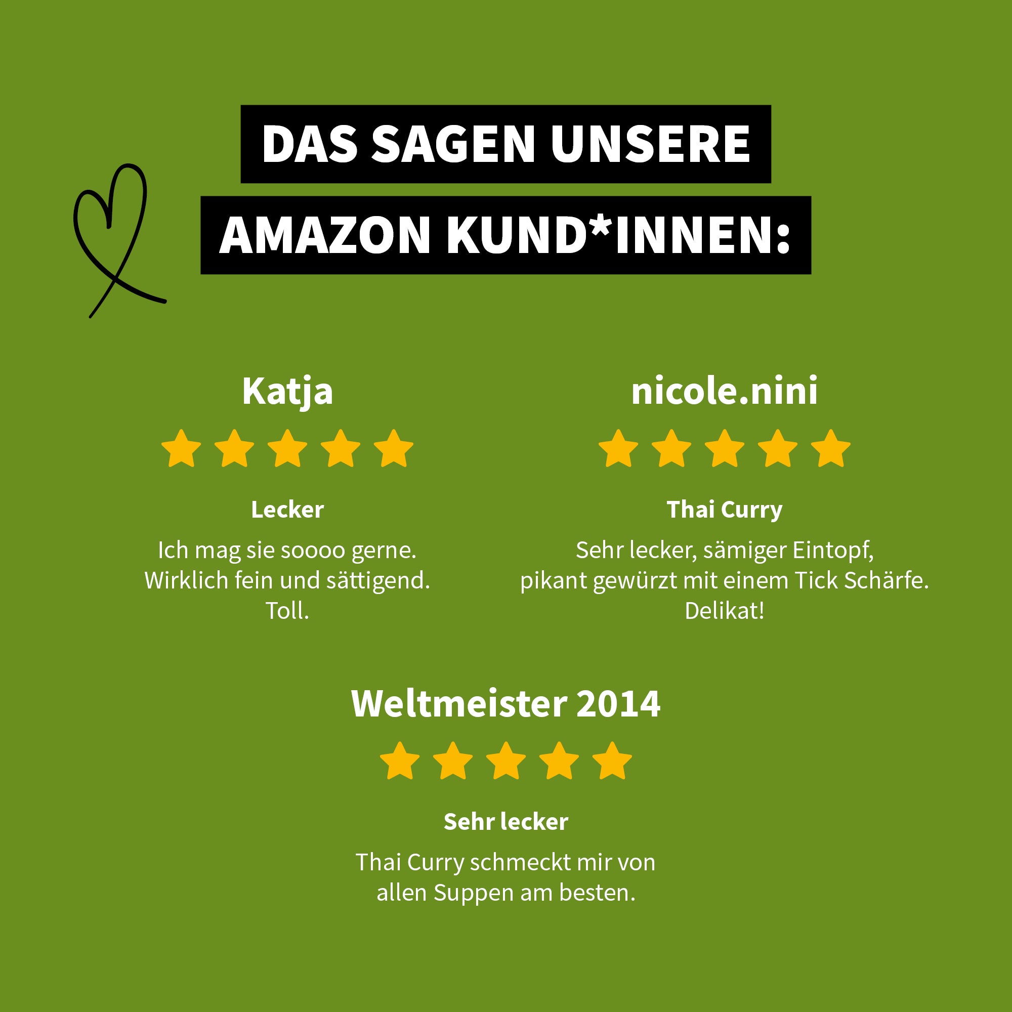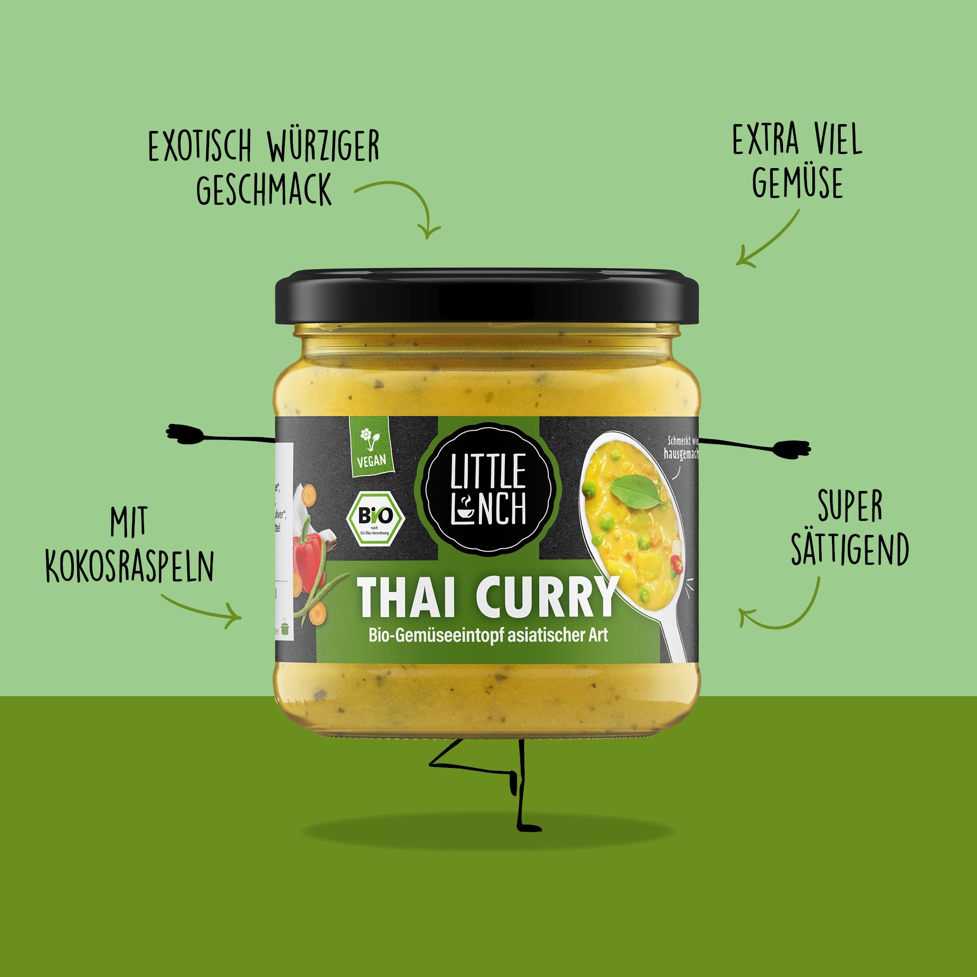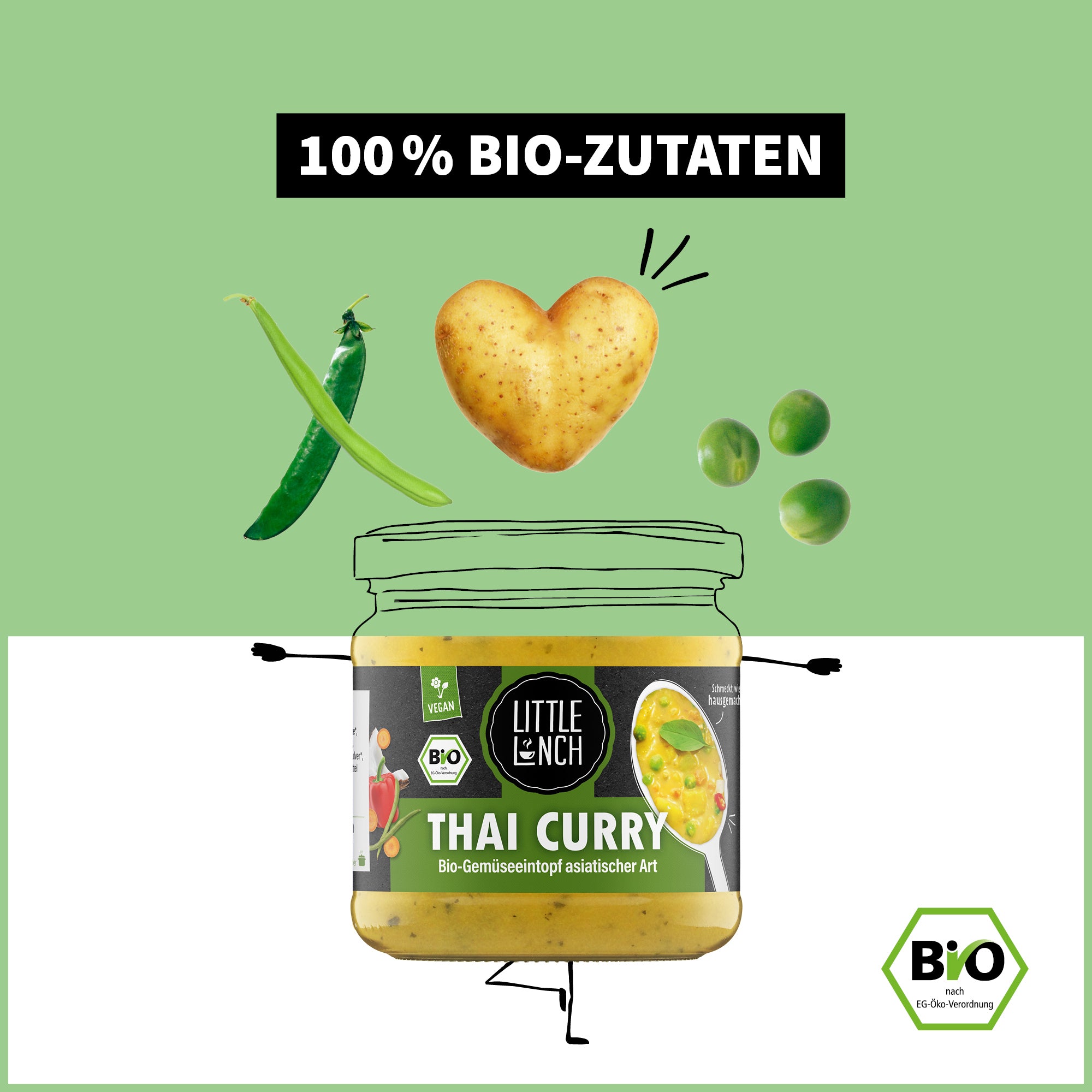 Wasser, Kartoffeln* 16%, Karotten* 12%, Zwiebeln* 6%, grüne Bohnen* 6%, Erbsen* 6%, rote Paprika* 5%, Traubensaft aus Traubensaftkonzentrat*, Stärke*, Kokosmehl* 1,5%, Sonnenblumenöl*, Meersalz, Currypulver* 0,6%, Knoblauch*, Korianderblätter*, Zitronengras*, Zitronensaftkonzentrat*, Verdickungsmittel (Guarkernmehl*, Johannisbrotkernmehl*).