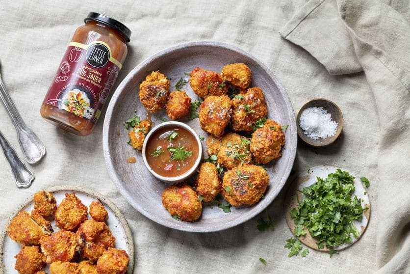 Veganes Fingerfood zum Dahinschmelzen! Diese mundgerechten Blumenkohl-Häppchen sind in Rekordzeit gemacht und schmecken fantastisch. Zusätzlich sorgt unsere Lieblingssauce Süß Sauer noch für die optimale Würze – Feddich ist das Soulfood 😍