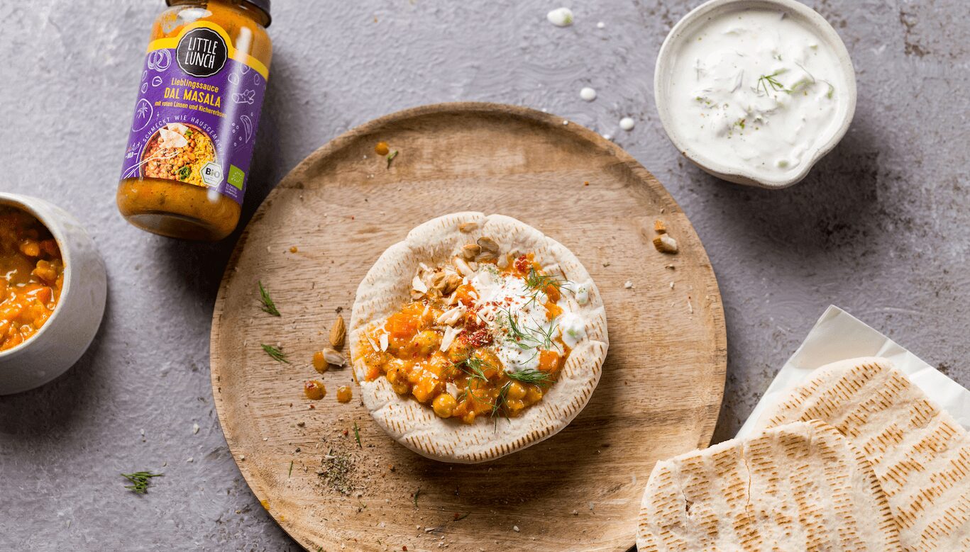 Das Dal Masala in einen kleinen Topf geben und bei niedriger Temperatur erhitzen. In der Zwischenzeit die Pitabrote kurz im vorgeheizten Backofen bei 180 Grad oder in der Pfanne für 1-2 Minuten erwärmen.