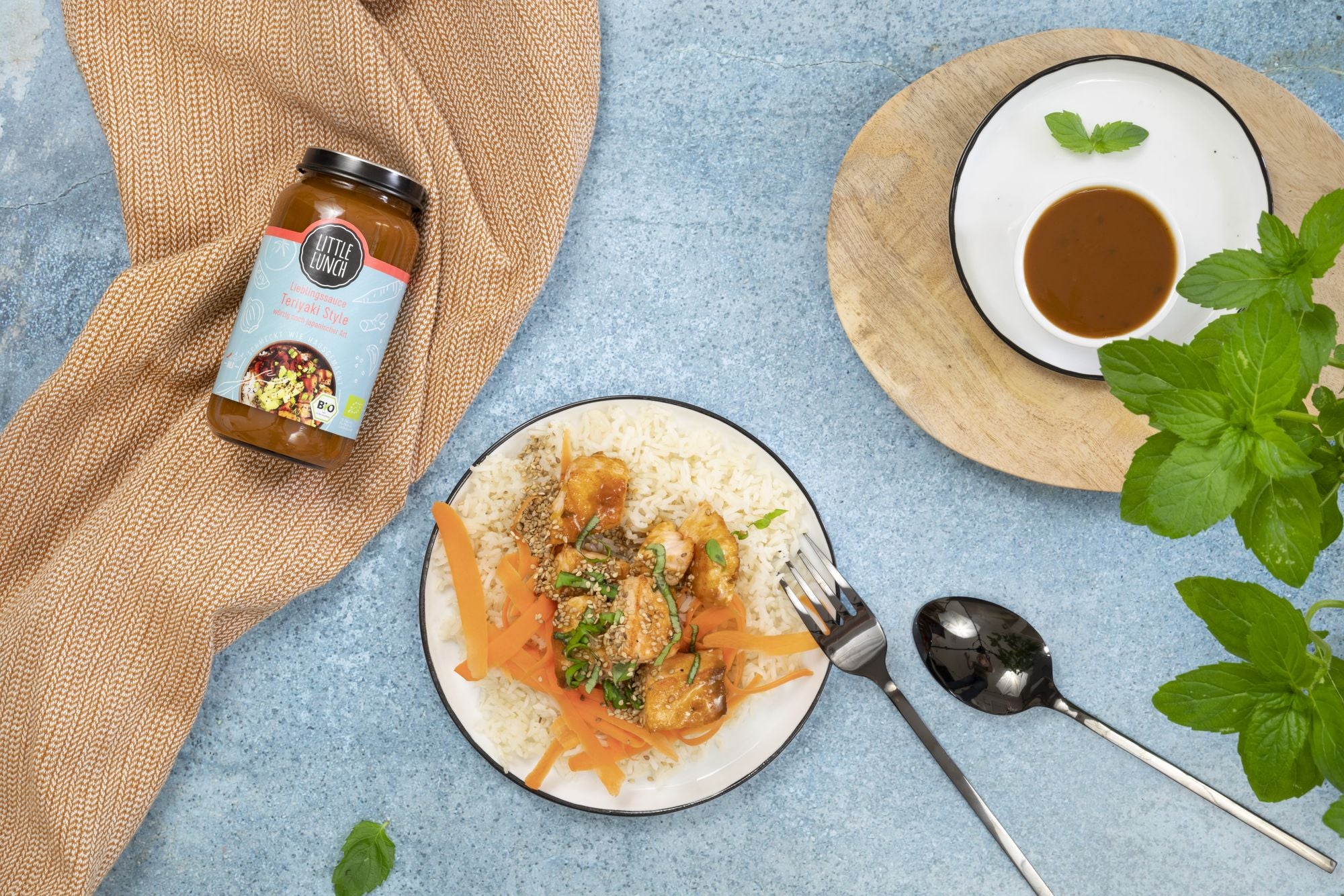 Wenn man an marinierten Lachs denkt, kommen einem zuerst die klassischen Kombinationen aus Honig und Senf, oder auch Knoblauch und Zitronensaft in den Sinn. Doch auch unsere würzige Teriyaki Style Sauce harmoniert hervorragend mit dem Fisch – und mit dem Reis erst recht! Neben den asiatischen Aromen sorgen außerdem Karotte und Minze für die nötige Frische.