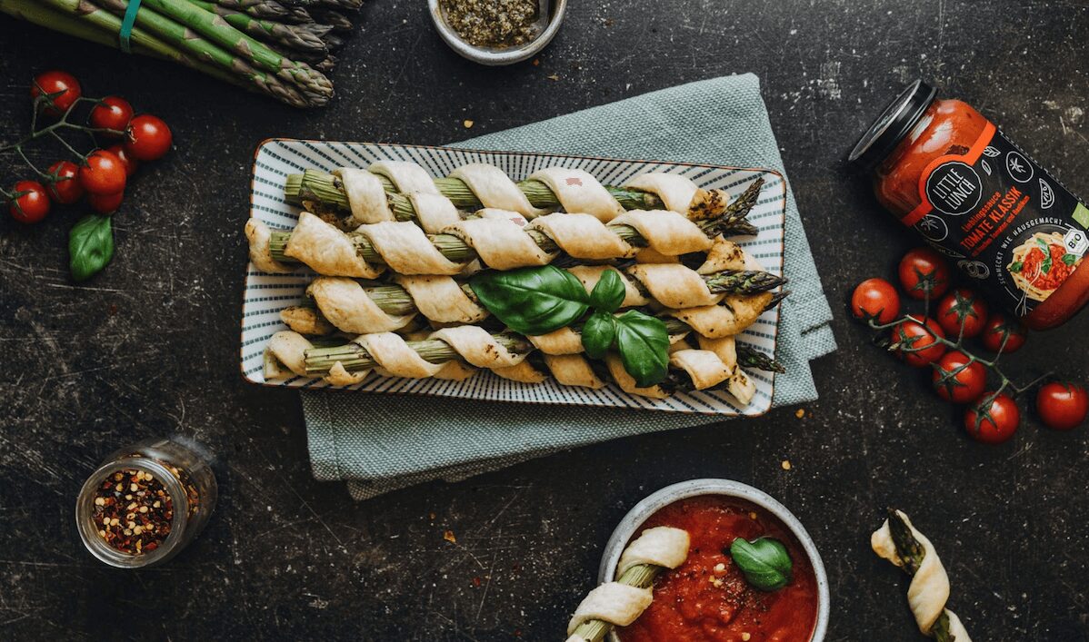 Währenddessen die Little Lunch Tomatensauce in einem Topf erhitzen und als Dip zu den Spargel-Röllchen servieren.