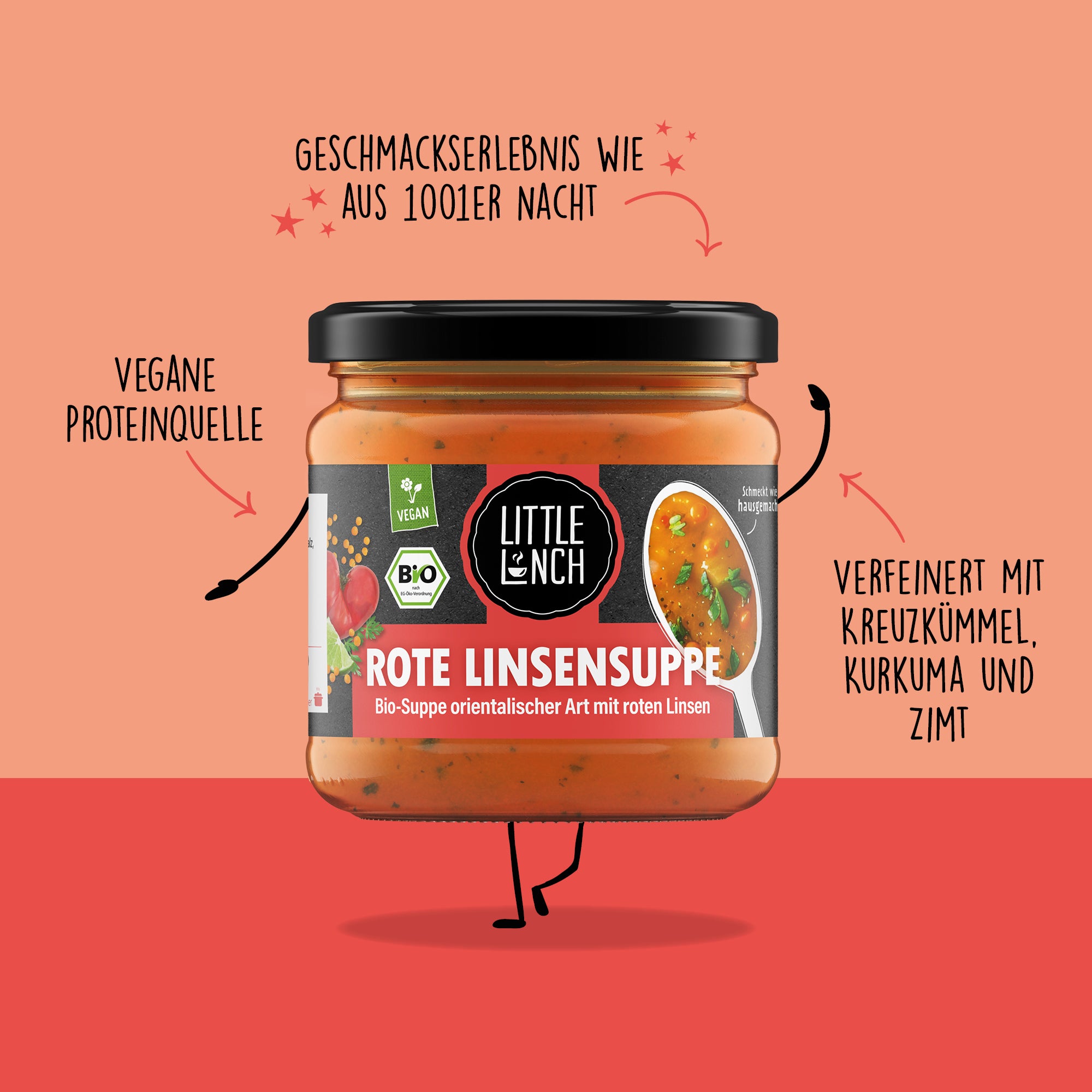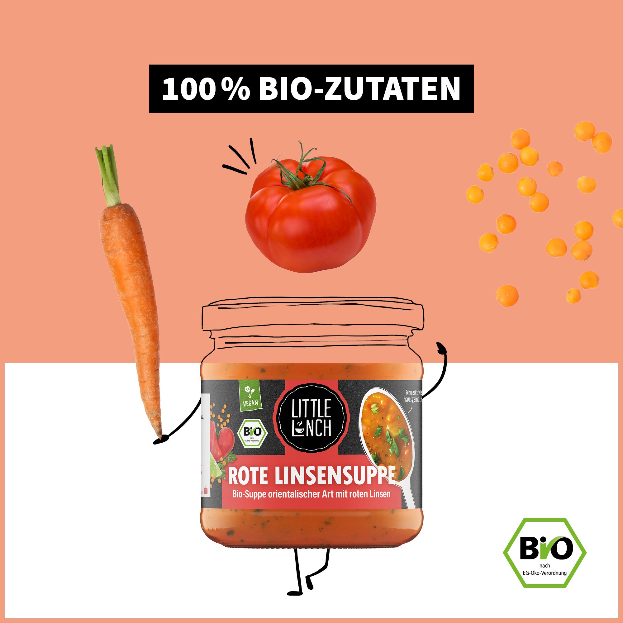 Wasser, rote Linsen* 17%, Karotten* 14%, Tomatenpüree* 14%, Sellerie* 6%, Bananen*, Zwiebeln* 4%, Stärke*, Sonnenblumenöl*, Meersalz, Limettensaft aus Limettensaftkonzentrat* 0,2%, Korianderblätter* 0,1%, Petersilie* 0,1%, Knoblauchpulver*, Ingwer*, Kurkuma*, Koriander*, Kreuzkümmel*, Paprikapulver*, Chilipulver*, Zimt*, Verdickungsmittel: Guarkernmehl* und Johannisbrotkernmehl*, Antioxidationsmittel: Ascorbinsäure und Zitronensäure.